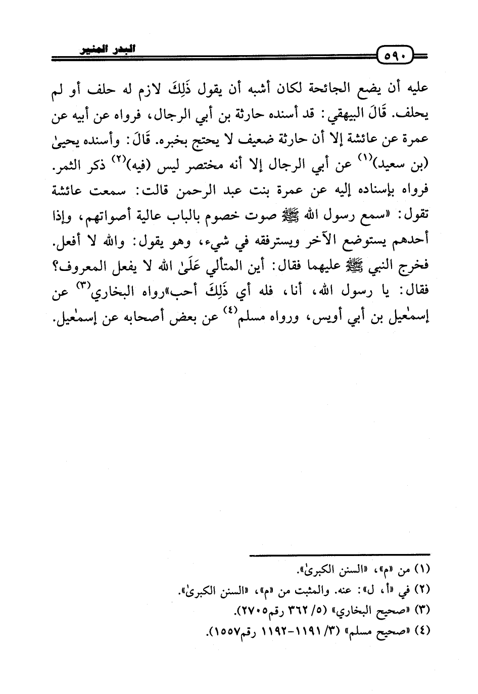 عَلَيْهِ أَن يضع الْجَائِحَة لَكَانَ أشبه أَن يَقُول ذَلِكَ لَازم لَهُ حلف أَو لم يحلف. قَالَ الْبَيْهَقِيّ: قد أسْندهُ حَارِثَة بن أبي الرِّجَال، فَرَوَاهُ عَن أَبِيه عَن عمْرَة عَن عَائِشَة إِلَّا أَن حَارِثَة ضَعِيف لَا يحْتَج بِخَبَرِهِ. قَالَ: وأسنده يَحْيَى (بن سعيد) عَن أبي الرِّجَال إِلَّا أَنه مُخْتَصر لَيْسَ (فِيهِ) ذكر الثَّمر. فَرَوَاهُ بِإِسْنَادِهِ إِلَيْهِ عَن عمْرَة بنت عبد الرَّحْمَن قَالَت: سَمِعت عَائِشَة تَقول: «سمع رَسُول الله - صَلَّى الله عَلَيْهِ وَسلم - صَوت خصوم بِالْبَابِ عالية أَصْوَاتهم، وَإِذا أحدهم يستوضع الآخر ويسترفقه فِي شَيْء، وَهُوَ يَقُول: وَالله لَا أفعل. فَخرج النَّبِي - صَلَّى الله عَلَيْهِ وَسلم - عَلَيْهِمَا فَقَالَ: أَيْن المتألي عَلَى الله لَا يفعل الْمَعْرُوف؟ فَقَالَ: يَا رَسُول الله، أَنا، فَلهُ أَي ذَلِكَ أحب» رَوَاهُ البُخَارِيّ عَن إِسْمَاعِيل بن أبي أويس، وَرَوَاهُ مُسلم عَن بعض أَصْحَابه عَن إِسْمَاعِيل.