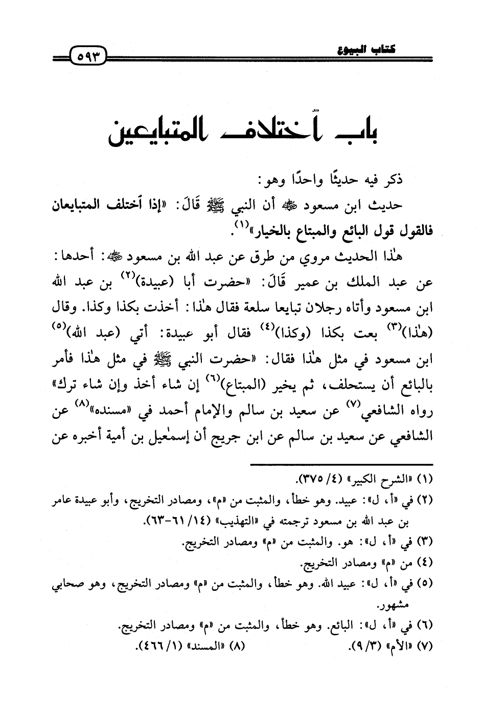 هَذَا الحَدِيث مَرْوِيّ من طرق عَن عبد الله بن مَسْعُود رَضي اللهُ عَنهُ: أَحدهَا: عَن عبد الْملك بن عُمَيْر قَالَ: «حضرت أَبَا (عُبَيْدَة) بن عبد الله بن مَسْعُود وَأَتَاهُ رجلَانِ تبَايعا سلْعَة فَقَالَ هَذَا: أخذت بِكَذَا وَكَذَا. وَقَالَ (هَذَا) بِعْت بِكَذَا (وَكَذَا) فَقَالَ أَبُو عُبَيْدَة: أُتِي (عبد الله) بن مَسْعُود فِي مثل هَذَا فَقَالَ: «حضرت النَّبِي - صَلَّى الله عَلَيْهِ وَسلم - فِي مثل هَذَا فَأمر بالبائع أَن يسْتَحْلف، ثمَّ يُخَيّر (الْمُبْتَاع) إِن شَاءَ أَخذ وَإِن شَاءَ ترك» رَوَاهُ الشَّافِعِي عَن سعيد بن سَالم وَالْإِمَام أَحْمد فِي «مُسْنده» عَن الشَّافِعِي عَن سعيد بن سَالم عَن ابْن جريج أَن إِسْمَاعِيل بن أُميَّة أخبرهُ عَن