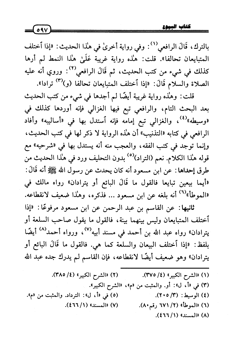 قلت: وَهَذِه رِوَايَة غَرِيبَة أَيْضا لم أَجدهَا فِي شَيْء من كتب الحَدِيث بعد الْبَحْث التَّام، والرافعي تبع فِيهَا الْغَزالِيّ فَإِنَّهُ أوردهَا كَذَلِك فِي «وسيطه» ، وَالْغَزالِيّ تبع إِمَامه فَإِنَّهُ اسْتدلَّ بهَا فِي «أساليبه» وَأفَاد الرَّافِعِيّ فِي كِتَابه «التذنيب» أَن هَذِه الرِّوَايَة لَا ذكر لَهَا فِي كتب الحَدِيث، وَإِنَّمَا تُوجد فِي كتب الْفِقْه، وَالْعجب مِنْهُ أَنه يسْتَدلّ بهَا فِي «شرحيه» مَعَ قَوْله هَذَا الْكَلَام. نعم (التراد) بِدُونِ التَّحْلِيف ورد فِي هَذَا الحَدِيث من طرق إِحْدَاهَا: عَن ابْن مَسْعُود أَنه كَانَ يحدث عَن رَسُول الله - صَلَّى الله عَلَيْهِ وَسلم - أَنه قَالَ: «أَيّمَا بيعين تبَايعا فَالْقَوْل مَا قَالَ البَائِع أَو يترادان» رَوَاهُ مَالك فِي «الْمُوَطَّأ» أَنه بلغه عَن ابْن مَسْعُود ... فَذكره، وَهَذَا ضَعِيف لانقطاعه.