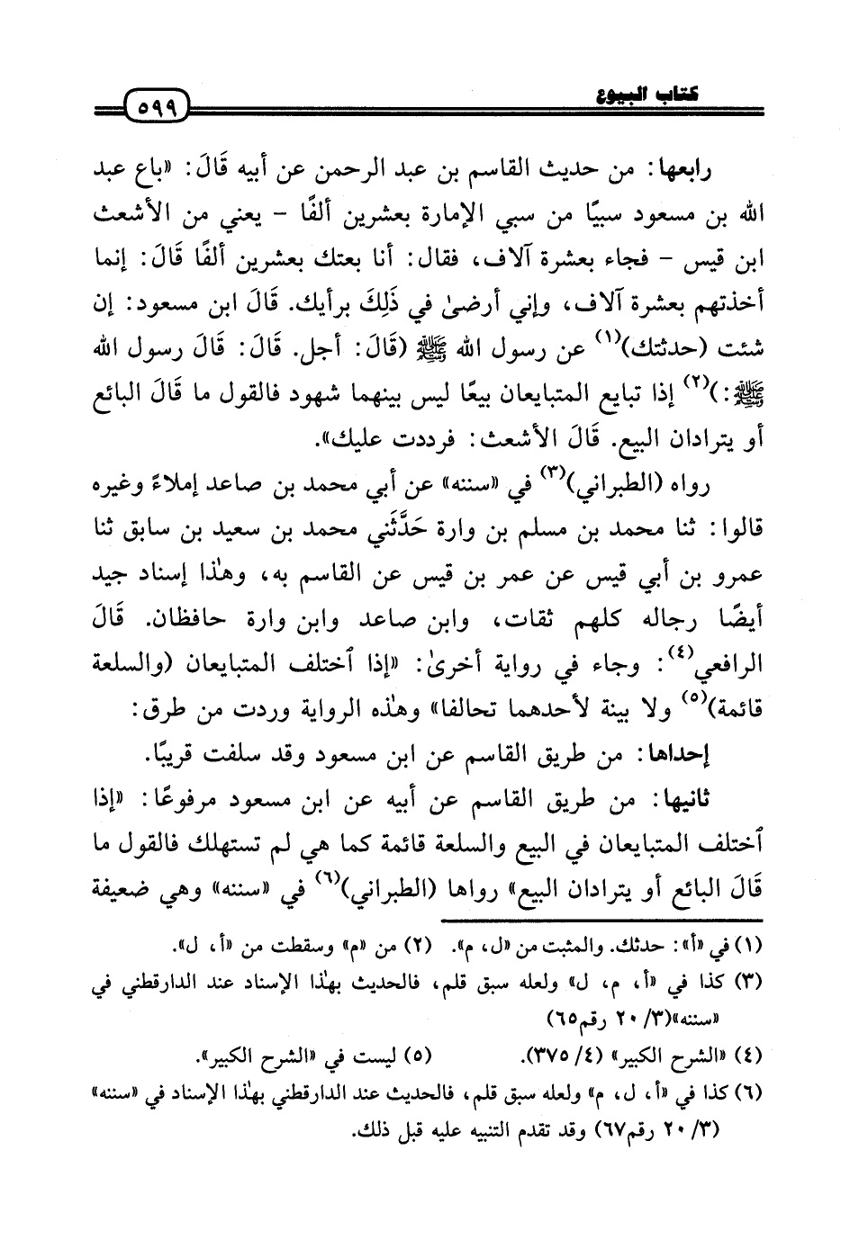 رَابِعهَا: من حَدِيث الْقَاسِم بن عبد الرَّحْمَن عَن أَبِيه قَالَ: «بَاعَ عبد الله بن مَسْعُود سبيًا من سبي الْإِمَارَة بِعشْرين ألفا - يَعْنِي من الْأَشْعَث بن قيس - فجَاء بِعشْرَة آلَاف، فَقَالَ: أَنا بِعْتُك بِعشْرين ألفا قَالَ: إِنَّمَا أخذتهم بِعشْرَة آلَاف، وَإِنِّي أَرْضَى فِي ذَلِكَ بِرَأْيِك. قَالَ ابْن مَسْعُود: إِن شِئْت (حدثتك) عَن رَسُول الله - صَلَّى الله عَلَيْهِ وَسلم - (قَالَ: أجل. قَالَ: قَالَ رَسُول الله - صَلَّى الله عَلَيْهِ وَسلم -:) إِذا تبَايع الْمُتَبَايعَانِ بيعا لَيْسَ بَينهمَا شُهُود فَالْقَوْل مَا قَالَ البَائِع أَو يترادان البيع. قَالَ الْأَشْعَث: فَرددت عَلَيْك» .