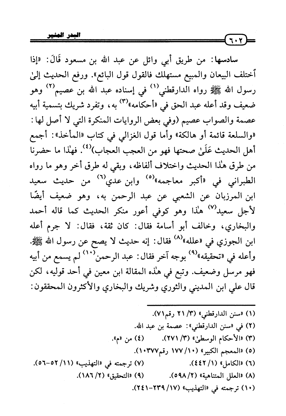 سادسها: من طَرِيق أبي وَائِل عَن عبد الله بن مَسْعُود قَالَ: «إِذا اخْتلف البيعان وَالْمَبِيع مستهلك فَالْقَوْل قَول البَائِع» . وَرفع الحَدِيث إِلَى رَسُول الله - صَلَّى الله عَلَيْهِ وَسلم - رَوَاهُ الدَّارَقُطْنِيّ فِي إِسْنَاده عبد الله بن عصيم وَهُوَ ضَعِيف وَقد أعله عبد الْحق فِي «أَحْكَامه» بِهِ، وَتفرد شريك بِتَسْمِيَة أَبِيه عصمَة وَالصَّوَاب عصيم (وَفِي بعض الرِّوَايَات الْمُنكرَة الَّتِي لَا أصل لَهَا: «والسلعة قَائِمَة أَو هالكة» وَأما قَول الْغَزالِيّ فِي كتاب «المأخذ» : أجمع أهل الحَدِيث عَلَى صِحَّتهَا فَهُوَ من الْعجب العجاب) . فَهَذَا مَا حَضَرنَا من طرق هَذَا الحَدِيث وَاخْتِلَاف أَلْفَاظه، وَبَقِي لَهُ طرق أخر وَهُوَ مَا رَوَاهُ الطَّبَرَانِيّ فِي «أكبر معاجمه» وَابْن عدي من حَدِيث سعيد بن الْمَرْزُبَان عَن الشّعبِيّ عَن عبد الرَّحْمَن بِهِ، وَهُوَ ضَعِيف أَيْضا لأجل سعيد هَذَا وَهُوَ كُوفِي أَعور مُنكر الحَدِيث كَمَا قَالَه أَحْمد وَالْبُخَارِيّ، وَخَالف أَبُو أُسَامَة فَقَالَ: كَانَ ثِقَة، فَقَالَ: لَا جرم أعله ابْن الْجَوْزِيّ فِي «علله» فَقَالَ: إِنَّه حَدِيث لَا يَصح عَن رَسُول الله - صَلَّى الله عَلَيْهِ وَسلم -. وَأعله فِي «تَحْقِيقه» بِوَجْه آخر فَقَالَ: عبد الرَّحْمَن لم يسمع من أَبِيه فَهُوَ مُرْسل وَضَعِيف. وَتبع فِي هَذِه الْمقَالة ابْن معِين فِي أحد قوليه، لَكِن قَالَ عَلّي بن الْمَدِينِيّ وَالثَّوْري وَشريك وَالْبُخَارِيّ وَالْأَكْثَرُونَ الْمُحَقِّقُونَ: