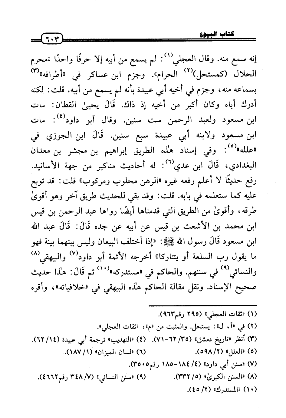 إِنَّه سمع مِنْهُ. وَقَالَ الْعجلِيّ: لم يسمع من أَبِيه إِلَّا حرفا وَاحِدًا «محرم الْحَلَال (كمستحل) الْحَرَام» . وَجزم ابْن عَسَاكِر فِي «أَطْرَافه» بِسَمَاعِهِ مِنْهُ، وَجزم فِي أَخِيه أبي عُبَيْدَة بِأَنَّهُ لم يسمع من أَبِيه. قلت: لكنه أدْرك أَبَاهُ وَكَانَ أكبر من أَخِيه إِذْ ذَاك. قَالَ يَحْيَى الْقطَّان: مَاتَ ابْن مَسْعُود ولعَبْد الرَّحْمَن سِتّ سِنِين. وَقَالَ أَبُو دَاوُد: مَاتَ ابْن مَسْعُود ولابنه أبي عُبَيْدَة سبع سِنِين. قَالَ ابْن الْجَوْزِيّ فِي «علله» : وَفِي إِسْنَاد هَذِه الطَّرِيق إِبْرَاهِيم بن مجشر بن معدان الْبَغْدَادِيّ، قَالَ ابْن عدي: لَهُ أَحَادِيث مَنَاكِير من جِهَة الْأَسَانِيد. رفع حَدِيثا لَا أعلم رَفعه غَيره «الرَّهْن محلوب ومركوب» قلت: قد توبع عَلَيْهِ كَمَا ستعلمه فِي بَابه. قلت: وَقد بَقِي للْحَدِيث طَرِيق آخر وَهُوَ أَقْوَى طرقه، وَأَقْوَى من الطَّرِيق الَّتِي قدمناها أَيْضا رَوَاهَا عبد الرَّحْمَن بن قيس بن مُحَمَّد بن الْأَشْعَث بن قيس عَن أَبِيه عَن جده قَالَ: قَالَ عبد الله بن مَسْعُود قَالَ رَسُول الله - صَلَّى الله عَلَيْهِ وَسلم -: «إِذا اخْتلف البيعان وَلَيْسَ بَينهمَا بَيِّنَة فَهُوَ مَا يَقُول رب السّلْعَة أَو يتتاركا» أخرجه الْأَئِمَّة أَبُو دَاوُد وَالْبَيْهَقِيّ وَالنَّسَائِيّ فِي سُنَنهمْ. وَالْحَاكِم فِي «مُسْتَدْركه» ثمَّ قَالَ: هَذَا حَدِيث صَحِيح الْإِسْنَاد. وَنقل مقَالَة الْحَاكِم هَذِه الْبَيْهَقِيّ فِي «خلافياته» ، وَأقرهُ
