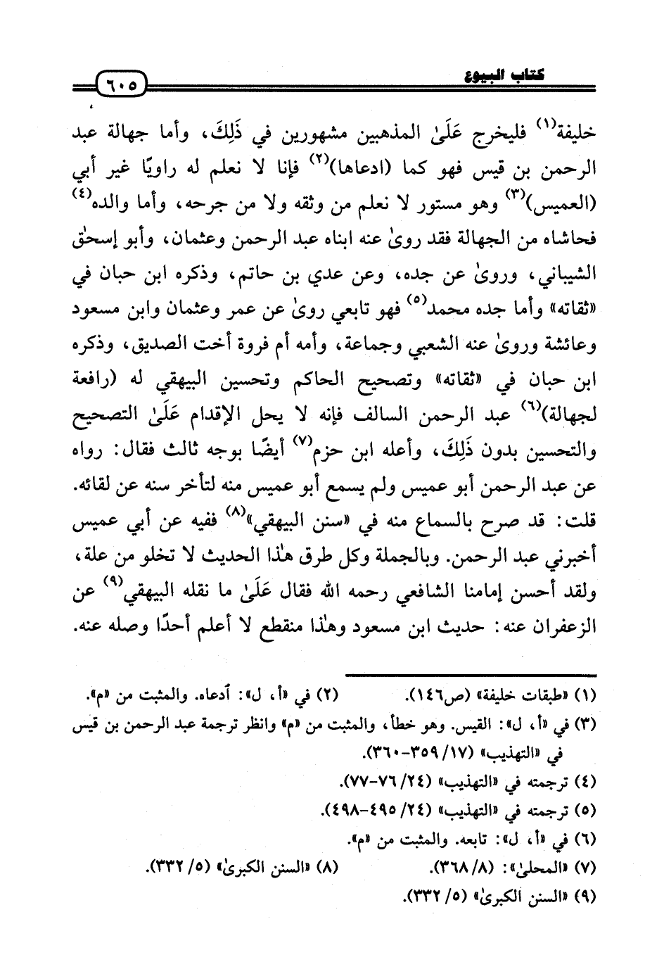 خَليفَة فَليخْرجْ عَلَى المذهبين مشهورين فِي ذَلِكَ، وَأما جَهَالَة عبد الرَّحْمَن بن قيس فَهُوَ كَمَا (ادَّعَاهَا) فَإنَّا لَا نعلم لَهُ رَاوِيا غير أبي (العميس) وَهُوَ مَسْتُور لَا نعلم من وَثَّقَهُ وَلَا من جرحه، وَأما وَالِده فحاشاه من الْجَهَالَة فقد رَوَى عَنهُ ابناه عبد الرَّحْمَن وَعُثْمَان، وَأَبُو إِسْحَاق الشَّيْبَانِيّ، وَرَوَى عَن جده، وَعَن عدي بن حَاتِم، وَذكره ابْن حبَان فِي «ثقاته» وَأما جده مُحَمَّد فَهُوَ تَابِعِيّ رَوَى عَن عمر وَعُثْمَان وَابْن مَسْعُود وَعَائِشَة وَرَوَى عَنهُ الشّعبِيّ وَجَمَاعَة، وَأمه أم فَرْوَة أُخْت الصّديق، وَذكره ابْن حبَان فِي «ثقاته» وَتَصْحِيح الْحَاكِم وتحسين الْبَيْهَقِيّ لَهُ (رَافِعَة لجَهَالَة) عبد الرَّحْمَن السالف فَإِنَّهُ لَا يحل الْإِقْدَام عَلَى التَّصْحِيح والتحسين بِدُونِ ذَلِكَ، وَأعله ابْن حزم أَيْضا بِوَجْه ثَالِث فَقَالَ: رَوَاهُ عَن عبد الرَّحْمَن أَبُو عُمَيْس وَلم يسمع أَبُو عُمَيْس مِنْهُ لتأخر سنه عَن لِقَائِه. قلت: قد صرح بِالسَّمَاعِ مِنْهُ فِي «سنَن الْبَيْهَقِيّ» فَفِيهِ عَن أبي عُمَيْس أَخْبرنِي عبد الرَّحْمَن. وَبِالْجُمْلَةِ وكل طرق هَذَا الحَدِيث لَا تَخْلُو من عِلّة، وَلَقَد أحسن إمامنا الشَّافِعِي رَحِمَهُ اللَّهُ فَقَالَ عَلَى مَا نَقله الْبَيْهَقِيّ عَن الزَّعْفَرَان عَنهُ: حَدِيث ابْن مَسْعُود وَهَذَا مُنْقَطع لَا أعلم أحدا وَصله عَنهُ.
