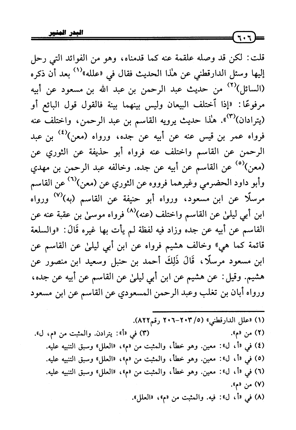 قلت: لَكِن قد وَصله عَلْقَمَة عَنهُ كَمَا قدمْنَاهُ، وَهُوَ من الْفَوَائِد الَّتِي رَحل إِلَيْهَا وَسُئِلَ الدَّارَقُطْنِيّ عَن هَذَا الحَدِيث فَقَالَ فِي «علله» بعد أَن ذكره (السَّائِل) من حَدِيث عبد الرَّحْمَن بن عبد الله بن مَسْعُود عَن أَبِيه مَرْفُوعا: «إِذا اخْتلف البيعان وَلَيْسَ بَينهمَا بَيِّنَة فَالْقَوْل قَول البَائِع أَو (يترادان) » . هَذَا حَدِيث يرويهِ الْقَاسِم بن عبد الرَّحْمَن، وَاخْتلف عَنهُ فَرَوَاهُ عمر بن قيس عَنهُ عَن أَبِيه عَن جده، وَرَوَاهُ (معن) بن عبد الرَّحْمَن عَن الْقَاسِم وَاخْتلف عَنهُ فَرَوَاهُ أَبُو حُذَيْفَة عَن الثَّوْريّ عَن (معن) عَن الْقَاسِم عَن أَبِيه عَن جده. وَخَالفهُ عبد الرَّحْمَن بن مهْدي وَأَبُو دَاوُد الْحَضْرَمِيّ وَغَيرهمَا فَرَوَوْه عَن الثَّوْريّ عَن (معن) عَن الْقَاسِم مُرْسلا عَن ابْن مَسْعُود، وَرَوَاهُ أَبُو حنيفَة عَن الْقَاسِم (بِهِ) وَرَوَاهُ ابْن أبي لَيْلَى عَن الْقَاسِم وَاخْتلف (عَنهُ) فَرَوَاهُ مُوسَى بن عقبَة عَنهُ عَن الْقَاسِم عَن أَبِيه عَن جده وَزَاد فِيهِ لَفْظَة لم يَأْتِ بهَا غَيره قَالَ: «والسلعة قَائِمَة كَمَا هِيَ» وَخَالف هشيم فَرَوَاهُ عَن ابْن أبي لَيْلَى عَن الْقَاسِم عَن ابْن مَسْعُود مُرْسلا، قَالَ ذَلِكَ أَحْمد بن حَنْبَل وَسَعِيد بن مَنْصُور عَن هشيم. وَقيل: عَن هشيم عَن ابْن أبي لَيْلَى عَن الْقَاسِم عَن أَبِيه عَن جده، وَرَوَاهُ أبان بن تغلب وَعبد الرَّحْمَن المَسْعُودِيّ عَن الْقَاسِم عَن ابْن مَسْعُود