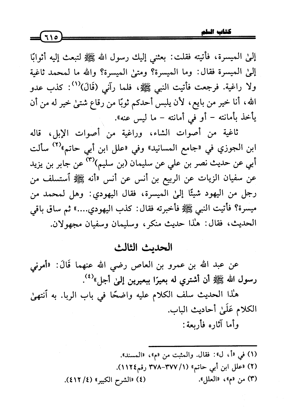 عَن عبد الله بن عَمْرو بن الْعَاصِ رَضي اللهُ عَنهما قَالَ: «أَمرنِي رَسُول الله - صَلَّى الله عَلَيْهِ وَسلم - أَن أَشْتَرِي لَهُ بَعِيرًا ببعيرين إِلَى أجل» .