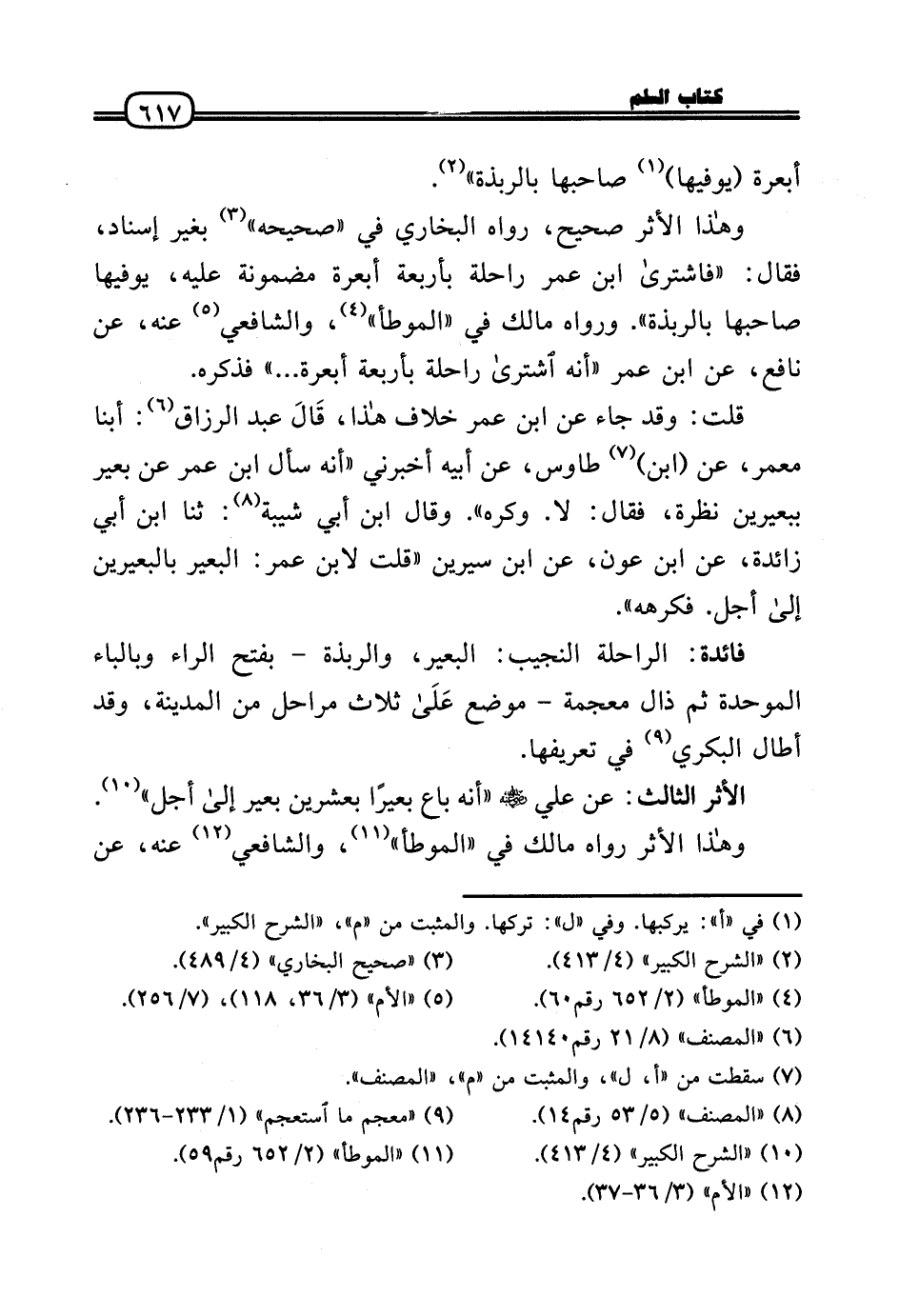 وَهَذَا الْأَثر صَحِيح، رَوَاهُ البُخَارِيّ فِي «صَحِيحه» بِغَيْر إِسْنَاد، فَقَالَ: «فَاشْتَرَى ابْن عمر رَاحِلَة بأَرْبعَة أَبْعِرَة مَضْمُونَة عَلَيْهِ، يوفيها صَاحبهَا بالربذة» . وَرَوَاهُ مَالك فِي «الْمُوَطَّأ» ، وَالشَّافِعِيّ عَنهُ، عَن نَافِع، عَن ابْن عمر «أَنه اشْتَرَى رَاحِلَة بأَرْبعَة أَبْعِرَة ... » فَذكره.