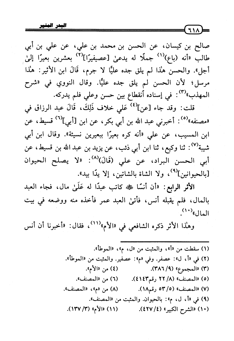 صَالح بن كيسَان، عَن الْحسن بن مُحَمَّد بن عَلّي، عَن عَلّي بن أبي طَالب «أَنه (بَاعَ) جملا لَهُ يُدعَى [عصيفيرًا] بِعشْرين بَعِيرًا إِلَى أجل» . وَالْحسن هَذَا لم يلق جده عليًّا لَا جرم، قَالَ ابْن الْأَثِير: هَذَا مُرْسل؛ لِأَن الْحسن لم يلق جده عليًّا. وَقَالَ النَّوَوِيّ فِي «شرح الْمُهَذّب» : فِي إِسْنَاده انْقِطَاع بَين حسن وَعلي فَلم يُدْرِكهُ.