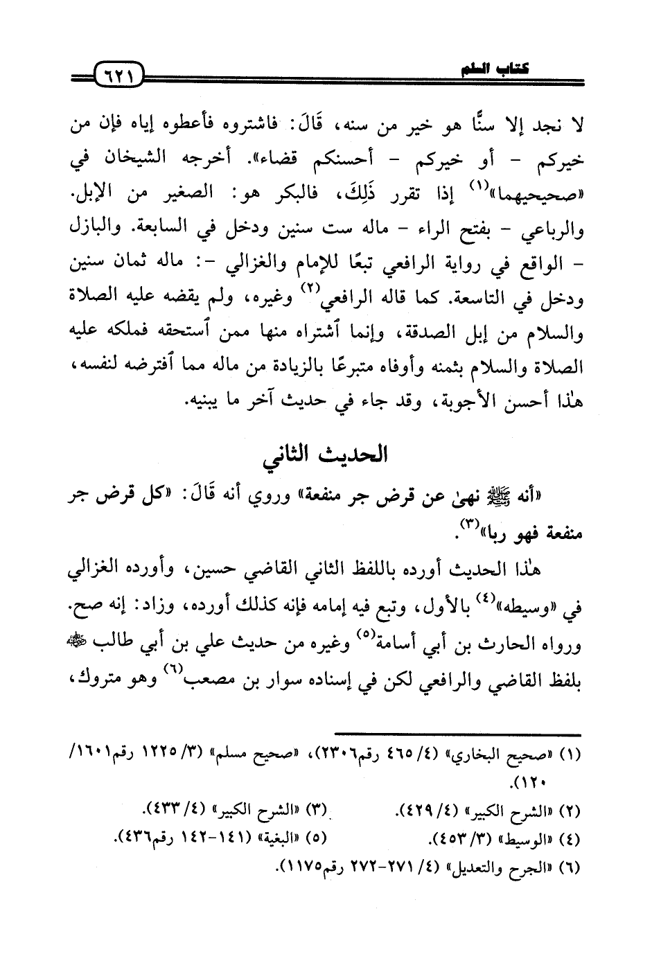 «أنَّه - صَلَّى الله عَلَيْهِ وَسلم - نهَى عَن قرض جر مَنْفَعَة» وَرُوِيَ أَنه قَالَ: «كل قرض جر مَنْفَعَة فَهُوَ رَبًّا» .