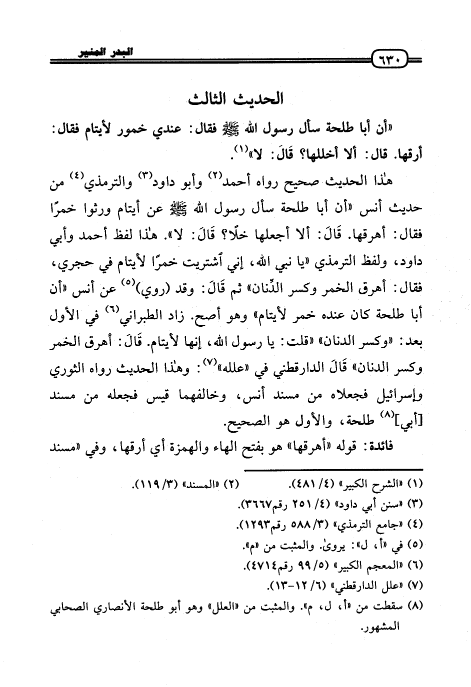هَذَا الحَدِيث صَحِيح رَوَاهُ أَحْمد وَأَبُو دَاوُد وَالتِّرْمِذِيّ من حَدِيث أنس «أَن أَبَا طَلْحَة سَأَلَ رَسُول الله - صَلَّى الله عَلَيْهِ وَسلم - عَن أَيْتَام ورثوا خمرًا فَقَالَ: أهرقها. قَالَ: أَلا أجعلها خلاًّ؟ قَالَ: لَا» . هَذَا لفظ أَحْمد وَأبي دَاوُد، وَلَفظ التِّرْمِذِيّ «يَا نَبِي الله، إِنِّي اشْتريت خمرًا لأيتام فِي حجري، فَقَالَ: أهرق الْخمر وَكسر الدِّنان» ثمَّ قَالَ: وَقد (رُوِيَ) عَن أنس «أَن أَبَا طَلْحَة كَانَ عِنْده خمر لأيتام» وَهُوَ أصح. زَاد الطَّبَرَانِيّ فِي الأول بعد: «وَكسر الدنان» «قلت: يَا رَسُول الله، إِنَّهَا لأيتام. قَالَ: أهرق الْخمر وَكسر الدنان» قَالَ الدَّارَقُطْنِيّ فِي «علله» : وَهَذَا الحَدِيث رَوَاهُ الثَّوْريّ وَإِسْرَائِيل فجعلاه من مُسْند أنس، وَخَالَفَهُمَا قيس فَجعله من مُسْند [أبي] طَلْحَة، وَالْأول هُوَ الصَّحِيح.
