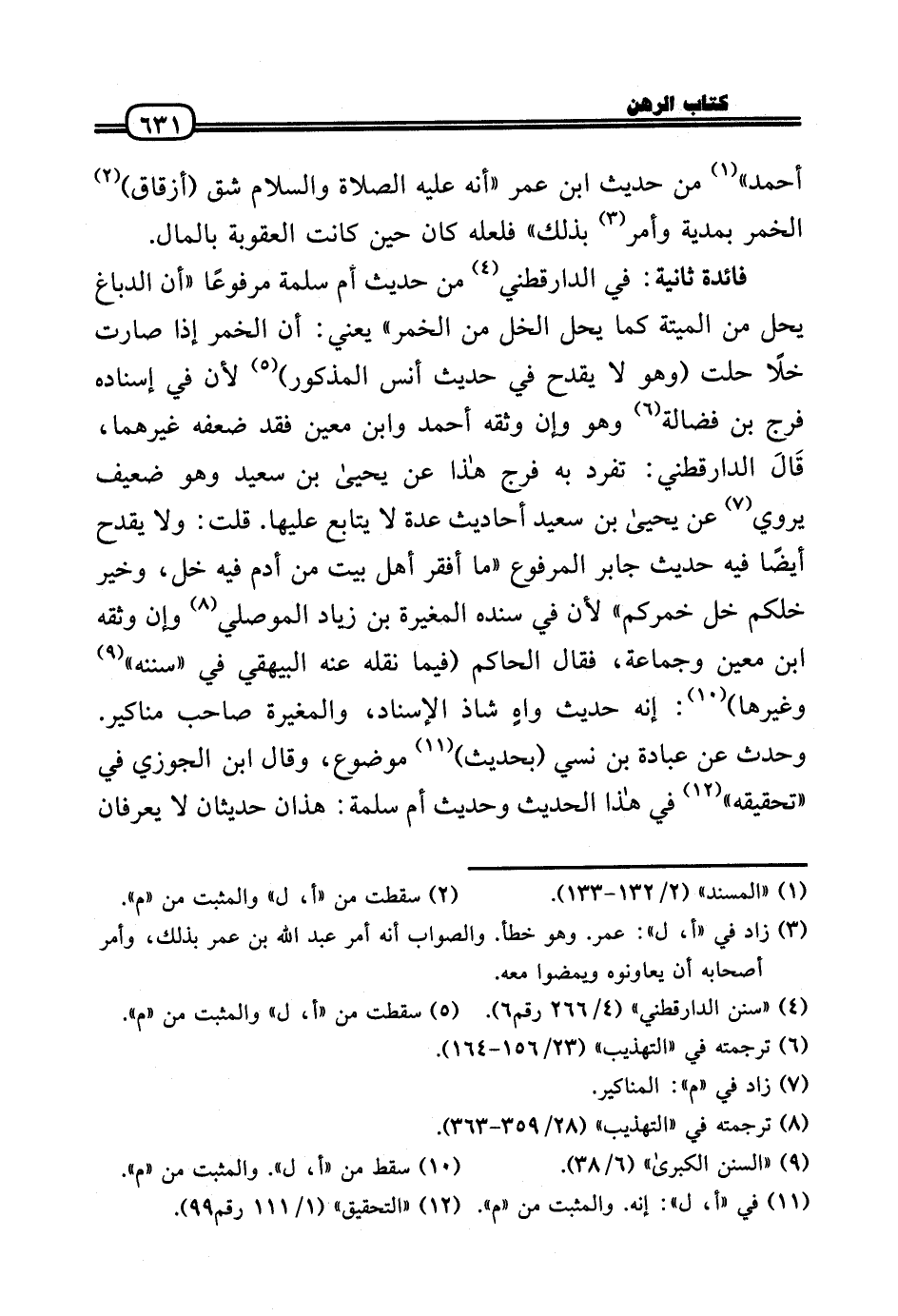 فَائِدَة ثَانِيَة: فِي الدَّارَقُطْنِيّ من حَدِيث أم سَلمَة مَرْفُوعا «أَن الدّباغ يحل من الْميتَة كَمَا يحل الْخلّ من الْخمر» يَعْنِي: أَن الْخمر إِذا صَارَت خلاًّ حلت (وَهُوَ لَا يقْدَح فِي حَدِيث أنس الْمَذْكُور) لِأَن فِي إِسْنَاده فرج بن فضَالة وَهُوَ وَإِن وَثَّقَهُ أَحْمد وَابْن معِين فقد ضعفه غَيرهمَا، قَالَ الدَّارَقُطْنِيّ: تفرد بِهِ فرج هَذَا عَن يَحْيَى بن سعيد وَهُوَ ضَعِيف يروي عَن يَحْيَى بن سعيد أَحَادِيث عدَّة لَا يُتَابع عَلَيْهَا. قلت: وَلَا يقْدَح أَيْضا فِيهِ حَدِيث جَابر الْمَرْفُوع «مَا أفقر أهل بَيت من أَدَم فِيهِ خل، وَخير خلكم خل خمركم» لِأَن فِي سَنَده الْمُغيرَة بن زِيَاد الْموصِلِي وَإِن وَثَّقَهُ ابْن معِين وَجَمَاعَة، فَقَالَ الْحَاكِم (فِيمَا نَقله عَنهُ الْبَيْهَقِيّ فِي «سنَنه» وَغَيرهَا) : إِنَّه حَدِيث واهٍ شَاذ الْإِسْنَاد، والمغيرة صَاحب مَنَاكِير. وَحدث عَن عبَادَة بن نسي (بِحَدِيث) مَوْضُوع، وَقَالَ ابْن الْجَوْزِيّ فِي «تَحْقِيقه» فِي هَذَا الحَدِيث وَحَدِيث أم سَلمَة: هَذَانِ حديثان لَا يعرفان