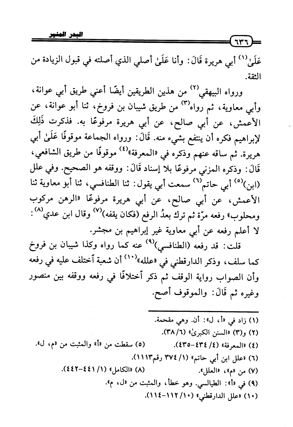 وَرَوَاهُ الْبَيْهَقِيّ من هذَيْن الطَّرِيقَيْنِ أَيْضا أَعنِي طَرِيق أبي عوَانَة، وَأبي مُعَاوِيَة، ثمَّ رَوَاهُ من طَرِيق شَيبَان بن فروخ، ثَنَا أَبُو عوَانَة، عَن الْأَعْمَش، عَن أبي صَالح، عَن أبي هُرَيْرَة مَرْفُوعا بِهِ. فَذكرت ذَلِكَ لإِبْرَاهِيم فكره أَن ينْتَفع بِشَيْء مِنْهُ. قَالَ: وَرَوَاهُ الْجَمَاعَة مَوْقُوفا عَلَى أبي هُرَيْرَة. ثمَّ سَاقه عَنْهُم وَذكره فِي «الْمعرفَة» مَوْقُوفا من طَرِيق الشَّافِعِي، قَالَ: وَذكره الْمُزنِيّ مَرْفُوعا بِلَا إِسْنَاد قَالَ: وَوَقفه هُوَ الصَّحِيح. وَفِي علل (ابْن) أبي حَاتِم سَمِعت أبي يَقُول: ثَنَا الطنافسي، ثَنَا أَبُو مُعَاوِيَة ثَنَا الْأَعْمَش، عَن أبي صَالح، عَن أبي هُرَيْرَة مَرْفُوعا «الرَّهْن مركوب ومحلوب» رَفعه مرّة ثمَّ ترك بعدُ الرّفْع (فَكَانَ يقفه) وَقَالَ ابْن عدي: لَا أعلم رَفعه عَن أبي مُعَاوِيَة غير إِبْرَاهِيم بن مجشر.