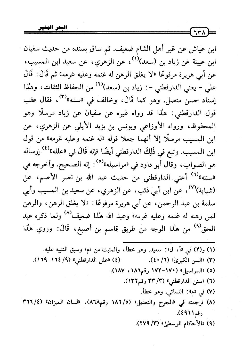 ابْن عَيَّاش عَن غير أهل الشَّام ضَعِيف. ثمَّ سَاق بِسَنَدِهِ من حَدِيث سُفْيَان بن عُيَيْنَة عَن زِيَاد بن (سعد) ، عَن الزُّهْرِيّ، عَن سعيد بن الْمسيب، عَن أبي هُرَيْرَة مَرْفُوعا «لَا يغلق الرَّهْن لَهُ غنمه وَعَلِيهِ غرمه» ثمَّ قَالَ: قَالَ عَلّي - يَعْنِي الدَّارَقُطْنِيّ -: زِيَاد بن (سعد) من الْحفاظ الثِّقَات، وَهَذَا إِسْنَاد حسن مُتَّصِل. وَهُوَ كَمَا قَالَ، وَخَالف فِي «سنَنه» ، فَقَالَ عقب قَول الدَّارَقُطْنِيّ: هَذَا قد رَوَاهُ غَيره عَن سُفْيَان عَن زِيَاد مُرْسلا وَهُوَ الْمَحْفُوظ، وَرَوَاهُ الْأَوْزَاعِيّ وَيُونُس بن يزِيد الْأَيْلِي عَن الزُّهْرِيّ، عَن ابْن الْمسيب مُرْسلا إِلَّا أَنَّهُمَا جعلا قَوْله «لَهُ غنمه وَعَلِيهِ غرمه» من قَول ابْن الْمسيب. وَتبع فِي ذَلِكَ الدَّارَقُطْنِيّ أَيْضا فَإِنَّهُ قَالَ فِي «علله» إرْسَاله هُوَ الصَّوَاب، وَقَالَ أَبُو دَاوُد فِي «مراسيله» : إِنَّه الصَّحِيح. وَأخرجه فِي «سنَنه» أَعنِي الدَّارَقُطْنِيّ من حَدِيث عبد الله بن نصر الْأَصَم، عَن (شَبابَة) ، عَن ابْن أبي ذِئْب، عَن الزُّهْرِيّ، عَن سعيد بن الْمسيب وَأبي سَلمَة بن عبد الرَّحْمَن، عَن أبي هُرَيْرَة مَرْفُوعا: «لَا يغلق الرَّهْن، وَالرَّهْن لمن رَهنه لَهُ غنمه وَعَلِيهِ غرمه» وَعبد الله هَذَا ضَعِيف وَلما ذكره عبد الْحق من هَذَا الْوَجْه من طَرِيق قَاسم بن أصبغ، قَالَ: وَرُوِيَ هَذَا
