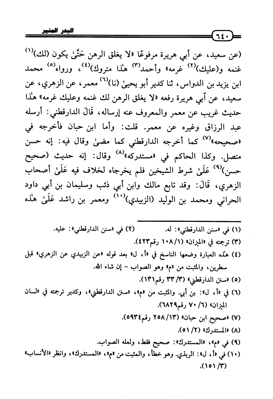 (عَن سعيد، عَن أبي هُرَيْرَة مَرْفُوعا «لَا يغلق الرَّهْن حَتَّى يكون (لَك) غنمه و (عَلَيْك) غرمه» وَأحمد هَذَا مَتْرُوك) ، وَرَوَاهُ مُحَمَّد بن يزِيد بن الدواس، ثَنَا كدير أَبُو يَحْيَى (نَا) معمر، عَن الزُّهْرِيّ، عَن سعيد، عَن ابي هُرَيْرَة رَفعه «لَا يغلق الرَّهْن لَك غنمه وَعَلَيْك غرمه» هَذَا حَدِيث غَرِيب عَن معمر وَالْمَعْرُوف عَنهُ إرْسَاله، قَالَ الدَّارَقُطْنِيّ: أرْسلهُ عبد الرَّزَّاق وَغَيره عَن معمر. قلت: وَأما ابْن حبَان فَأخْرجهُ فِي «صَحِيحه» كَمَا أخرجه الدَّارَقُطْنِيّ كَمَا مَضَى وَقَالَ فِيهِ: إِنَّه حسن مُتَّصِل. وَكَذَا الْحَاكِم فِي «مُسْتَدْركه» وَقَالَ: إِنَّه حَدِيث (صَحِيح حسن) عَلَى شَرط الشَّيْخَيْنِ فَلم يخرجَاهُ لخلاف فِيهِ عَلَى أَصْحَاب الزُّهْرِيّ، قَالَ: وَقد تَابع مَالك وَابْن أبي ذِئْب وَسليمَان بن أبي دَاوُد الْحَرَّانِي وَمُحَمّد بن الْوَلِيد (الزبيدِيّ) وَمعمر بن رَاشد عَلَى هَذِه