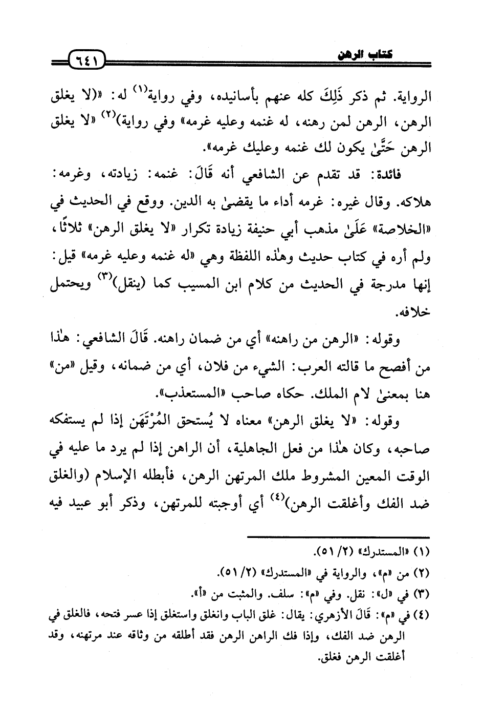 الرِّوَايَة. ثمَّ ذكر ذَلِكَ كُله عَنْهُم بأسانيده، وَفِي رِوَايَة لَهُ: « (لَا يغلق الرَّهْن، الرَّهْن لمن رَهنه، لَهُ غنمه وَعَلِيهِ غرمه» وَفِي رِوَايَة) «لَا يغلق الرَّهْن حَتَّى يكون لَك غنمه وَعَلَيْك غرمه» .