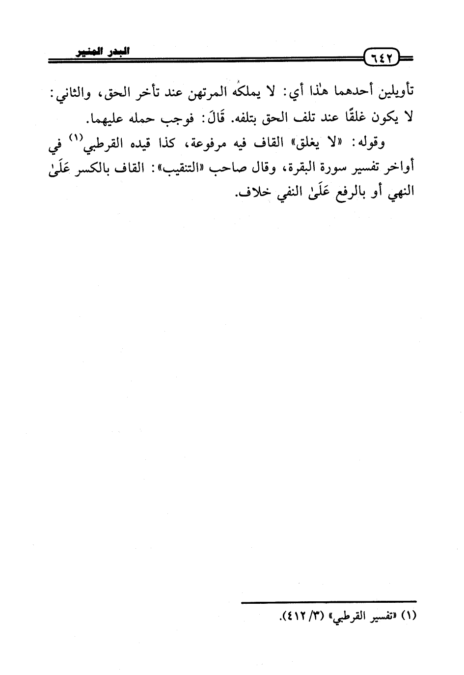 تأويلين أَحدهمَا هَذَا أَي: لَا يملكهُ الْمُرْتَهن عِنْد تَأَخّر الْحق، وَالثَّانِي: لَا يكون غلقًا عِنْد تلف الْحق بتلفه. قَالَ: فَوَجَبَ حمله عَلَيْهِمَا.
