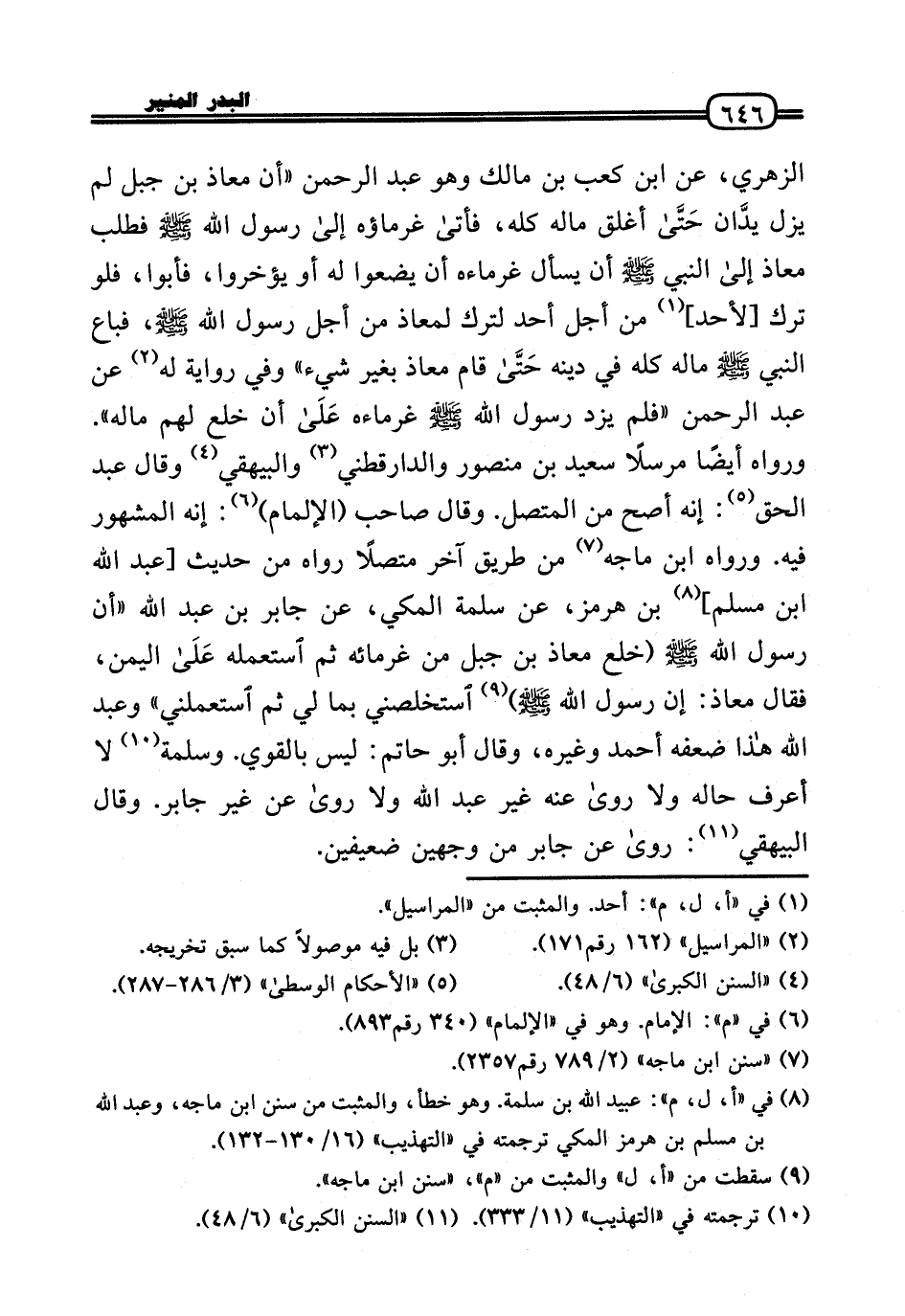 الزُّهْرِيّ، عَن ابْن كَعْب بن مَالك وَهُوَ عبد الرَّحْمَن «أَن معَاذ بن جبل لم يزل يدَّان حَتَّى أغلق مَاله كُله، فَأَتَى غرماؤه إِلَى رَسُول الله - صَلَّى الله عَلَيْهِ وَسلم - فَطلب معَاذ إِلَى النَّبِي - صَلَّى الله عَلَيْهِ وَسلم - أَن يسْأَل غرماءه أَن يضعوا لَهُ أَو يؤخروا، فَأَبَوا، فَلَو ترك [لأحد] من أجل أحد لترك لِمعَاذ من أجل رَسُول الله - صَلَّى الله عَلَيْهِ وَسلم -، فَبَاعَ النَّبِي - صَلَّى الله عَلَيْهِ وَسلم - مَاله كُله فِي دينه حَتَّى قَامَ معَاذ بِغَيْر شَيْء» وَفِي رِوَايَة لَهُ عَن عبد الرَّحْمَن «فَلم يزدْ رَسُول الله - صَلَّى الله عَلَيْهِ وَسلم - غرماءه عَلَى أَن خلع لَهُم مَاله» . وَرَوَاهُ أَيْضا مُرْسلا سعيد بن مَنْصُور وَالدَّارَقُطْنِيّ وَالْبَيْهَقِيّ وَقَالَ عبد الْحق: إِنَّه أصح من الْمُتَّصِل. وَقَالَ صَاحب (الْإِلْمَام) : إِنَّه الْمَشْهُور فِيهِ. وَرَوَاهُ ابْن مَاجَه من طَرِيق آخر مُتَّصِلا رَوَاهُ من حَدِيث [عبد الله بن مُسلم] بن هُرْمُز، عَن سَلمَة الْمَكِّيّ، عَن جَابر بن عبد الله «أَن رَسُول الله - صَلَّى الله عَلَيْهِ وَسلم - (خلع معَاذ بن جبل من غُرَمَائه ثمَّ اسْتَعْملهُ عَلَى الْيمن، فَقَالَ معَاذ: إِن رَسُول الله - صَلَّى الله عَلَيْهِ وَسلم -) استخلصني بِمَا لي ثمَّ استعملني» وَعبد الله هَذَا ضعفه أَحْمد وَغَيره، وَقَالَ أَبُو حَاتِم: لَيْسَ بِالْقَوِيّ. وَسَلَمَة لَا أعرف حَاله وَلَا رَوَى عَنهُ غير عبد الله وَلَا رَوَى عَن غير جَابر. وَقَالَ الْبَيْهَقِيّ: رَوَى عَن جَابر من وَجْهَيْن ضعيفين.