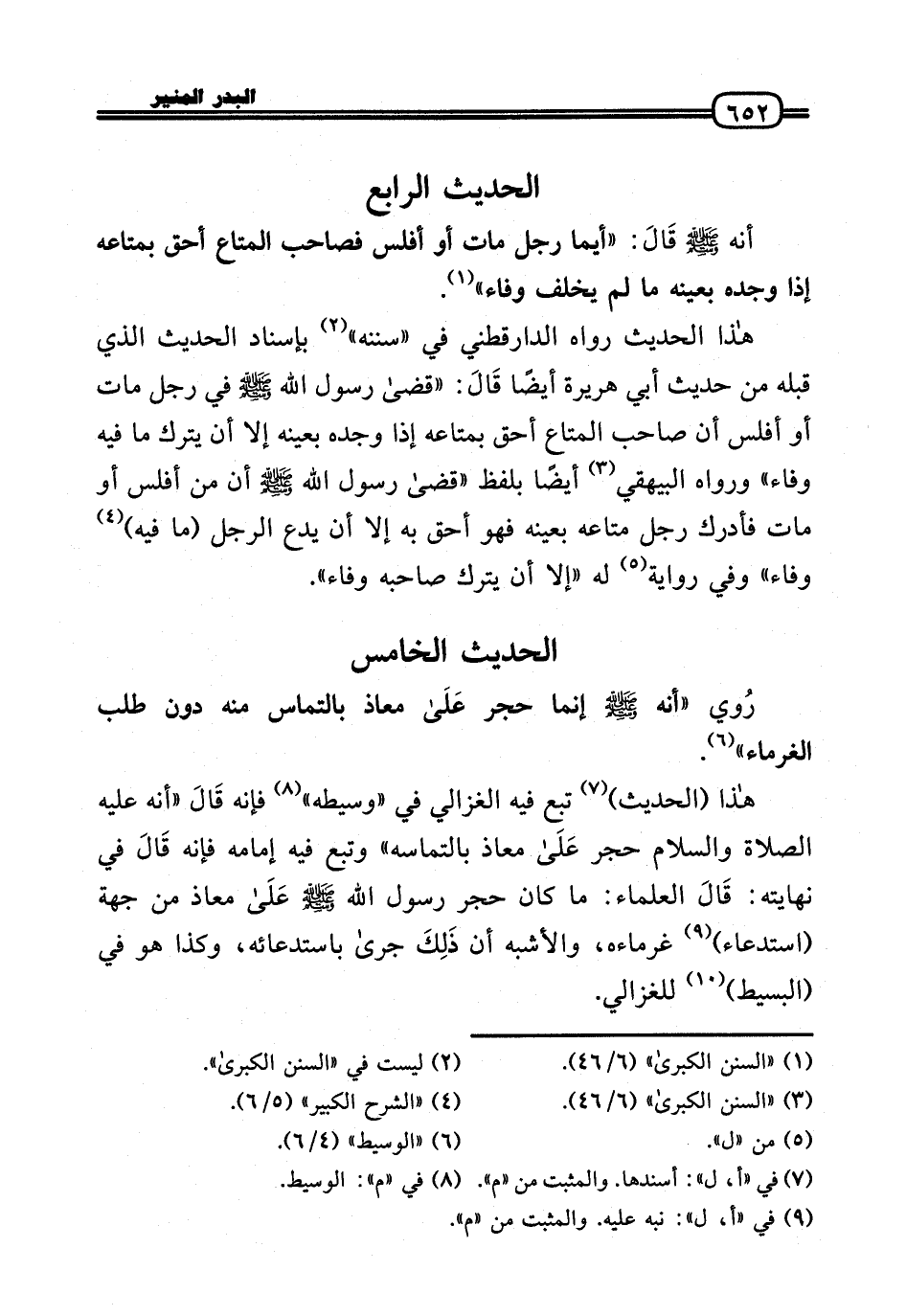هَذَا الحَدِيث رَوَاهُ الدَّارَقُطْنِيّ فِي «سنَنه» بِإِسْنَاد الحَدِيث الَّذِي قبله من حَدِيث أبي هُرَيْرَة أَيْضا قَالَ: «قَضَى رَسُول الله - صَلَّى الله عَلَيْهِ وَسلم - فِي رجل مَاتَ أَو أفلس أَن صَاحب الْمَتَاع أَحَق بمتاعه إِذا وجده بِعَيْنِه إِلَّا أَن يتْرك مَا فِيهِ وَفَاء» وَرَوَاهُ الْبَيْهَقِيّ أَيْضا بِلَفْظ «قَضَى رَسُول الله - صَلَّى الله عَلَيْهِ وَسلم - أَن من أفلس أَو مَاتَ فَأدْرك رجل مَتَاعه بِعَيْنِه فَهُوَ أَحَق بِهِ إِلَّا أَن يدع الرجل (مَا فِيهِ) وَفَاء» وَفِي رِوَايَة لَهُ «إِلَّا أَن يتْرك صَاحبه وَفَاء» .