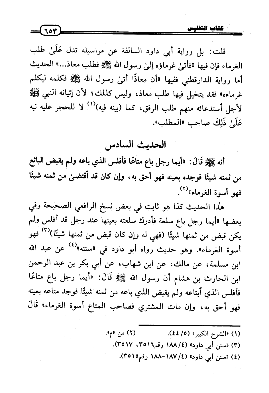 هَذَا الحَدِيث كَذَا هُوَ ثَابت فِي بعض نسخ الرَّافِعِيّ الصَّحِيحَة وَفِي بَعْضهَا «أَيّمَا رجل بَاعَ سلْعَة فَأدْرك سلْعَته بِعَينهَا عِنْد رجل قد أفلس وَلم يكن قبض من ثمنهَا شَيْئا (فَهِيَ لَهُ وَإِن كَانَ قبض من ثمنهَا شَيْئا) فَهُوَ أُسْوَة الْغُرَمَاء» . وَهُوَ حَدِيث رَوَاهُ أَبُو دَاوُد فِي «سنَنه» عَن عبد الله بن مسلمة، عَن مَالك، عَن ابْن شهَاب، عَن أبي بكر بن عبد الرَّحْمَن بن الْحَارِث بن هِشَام أَن رَسُول الله - صَلَّى الله عَلَيْهِ وَسلم - قَالَ: «أَيّمَا رجل بَاعَ مَتَاعا فأفلس الَّذِي ابتاعه وَلم يقبض الَّذِي بَاعه من ثمنه شَيْئا فَوجدَ مَتَاعه بِعَيْنِه فَهُوَ أَحَق بِهِ، وَإِن مَاتَ المُشْتَرِي فَصَاحب الْمَتَاع أُسْوَة الْغُرَمَاء» قَالَ
