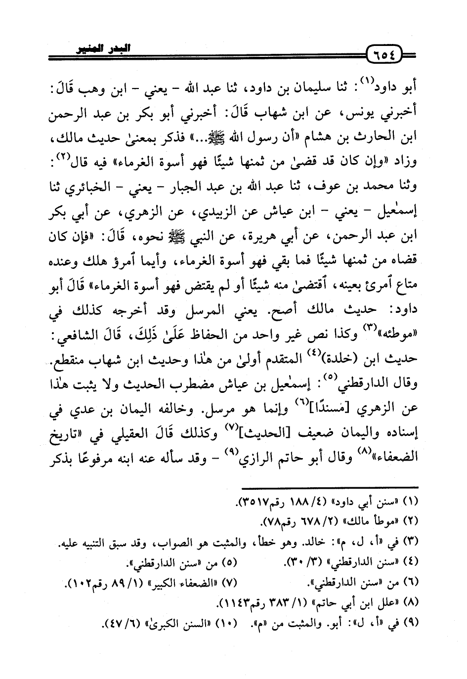 أَبُو دَاوُد: ثَنَا سُلَيْمَان بن دَاوُد، ثَنَا عبد الله - يَعْنِي - ابْن وهب قَالَ: أَخْبرنِي يُونُس، عَن ابْن شهَاب قَالَ: أَخْبرنِي أَبُو بكر بن عبد الرَّحْمَن بن الْحَارِث بن هِشَام «أَن رَسُول الله - صَلَّى الله عَلَيْهِ وَسلم - ... » فَذكر بِمَعْنى حَدِيث مَالك، وَزَاد «وَإِن كَانَ قد قَضَى من ثمنهَا شَيْئا فَهُوَ أُسْوَة الْغُرَمَاء» فِيهِ قَالَ: وثنا مُحَمَّد بن عَوْف، ثَنَا عبد الله بن عبد الْجَبَّار - يَعْنِي - الخبائري ثَنَا إِسْمَاعِيل - يَعْنِي - ابْن عَيَّاش عَن الزبيدِيّ، عَن الزُّهْرِيّ، عَن أبي بكر بن عبد الرَّحْمَن، عَن أبي هُرَيْرَة، عَن النَّبِي - صَلَّى الله عَلَيْهِ وَسلم - نَحوه، قَالَ: «فَإِن كَانَ قَضَاهُ من ثمنهَا شَيْئا فَمَا بَقِي فَهُوَ أُسْوَة الْغُرَمَاء، وَأَيّمَا امْرُؤ هلك وَعِنْده مَتَاع امْرِئ بِعَيْنِه، اقْتَضَى مِنْهُ شَيْئا أَو لم يقتض فَهُوَ أُسْوَة الْغُرَمَاء» قَالَ أَبُو دَاوُد: حَدِيث مَالك أصح. يَعْنِي الْمُرْسل وَقد أخرجه كَذَلِك فِي «موطئِهِ» وَكَذَا نَص غير وَاحِد من الْحفاظ عَلَى ذَلِكَ، قَالَ الشَّافِعِي: حَدِيث ابْن (خلدَة) الْمُتَقَدّم أولَى من هَذَا وَحَدِيث ابْن شهَاب مُنْقَطع. وَقَالَ الدَّارَقُطْنِيّ: إِسْمَاعِيل بن عَيَّاش مُضْطَرب الحَدِيث وَلَا يثبت هَذَا عَن الزُّهْرِيّ [مُسْندًا] وَإِنَّمَا هُوَ مُرْسل. وَخَالفهُ الْيَمَان بن عدي فِي إِسْنَاده واليمان ضَعِيف [الحَدِيث] وَكَذَلِكَ قَالَ الْعقيلِيّ فِي «تَارِيخ الضُّعَفَاء» وَقَالَ أَبُو حَاتِم الرَّازِيّ - وَقد سَأَلَهُ عَنهُ ابْنه مَرْفُوعا بِذكر