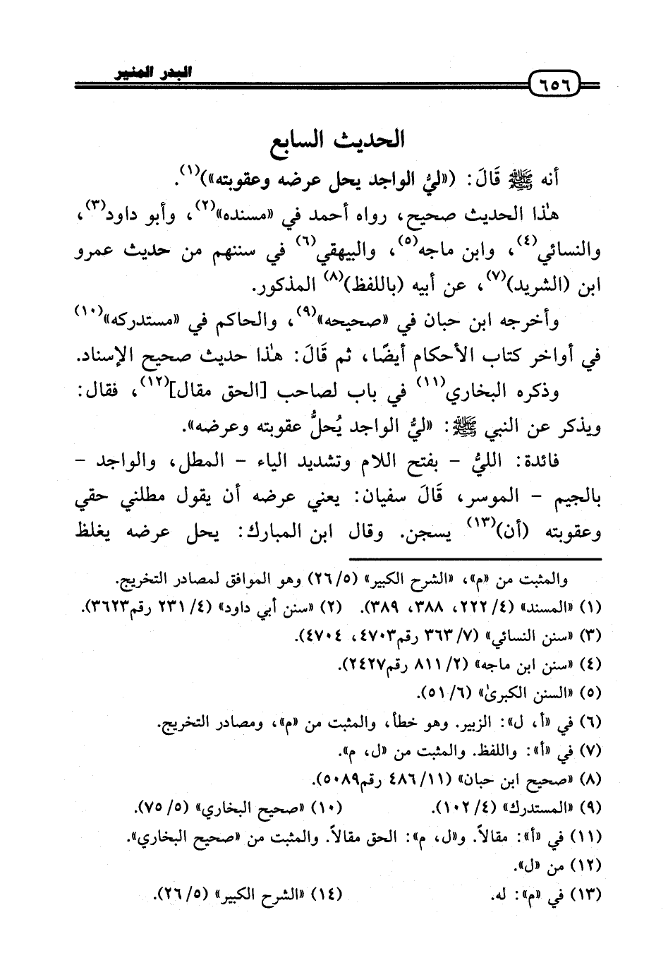 أنَّه - صَلَّى الله عَلَيْهِ وَسلم - قَالَ: « (ليُّ الْوَاجِد يحل عرضه وعقوبته» ) .