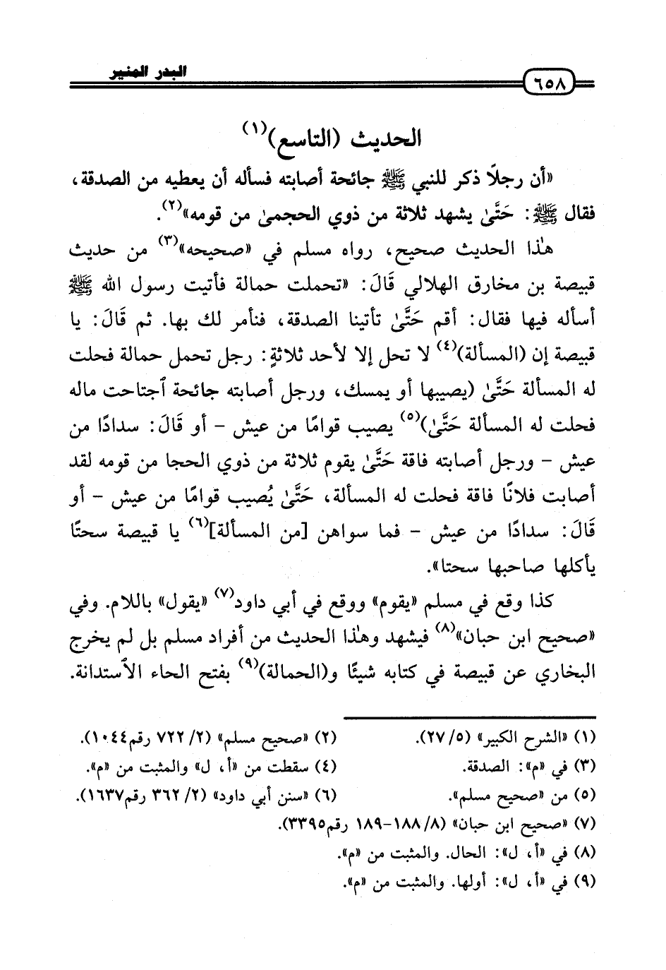 هَذَا الحَدِيث صَحِيح، رَوَاهُ مُسلم فِي «صَحِيحه» من حَدِيث قبيصَة بن مُخَارق الْهِلَالِي قَالَ: «تحملت حمالَة فَأتيت رَسُول الله - صَلَّى الله عَلَيْهِ وَسلم - أسأله فِيهَا فَقَالَ: أقِم حَتَّى تَأْتِينَا الصَّدَقَة، فنأمر لَك بهَا. ثمَّ قَالَ: يَا قبيصَة إِن (الْمَسْأَلَة) لَا تحل إِلَّا لأحد ثلاثةٍ: رجل تحمل حمالَة فَحلت لَهُ الْمَسْأَلَة حَتَّى (يُصِيبهَا أَو يمسك، وَرجل أَصَابَته جَائِحَة اجتاحت مَاله فَحلت لَهُ الْمَسْأَلَة حَتَّى) يُصِيب قوامًا من عَيْش - أَو قَالَ: سدادًا من عَيْش - وَرجل أَصَابَته فاقة حَتَّى يقوم ثَلَاثَة من ذَوي الحجا من قومه لقد أَصَابَت فلَانا فاقة فَحلت لَهُ الْمَسْأَلَة، حَتَّى يُصيب قوامًا من عَيْش - أَو قَالَ: سدادًا من عَيْش - فَمَا سواهن [من الْمَسْأَلَة] يَا قبيصَة سحتًا يأكلها صَاحبهَا سحتا» .