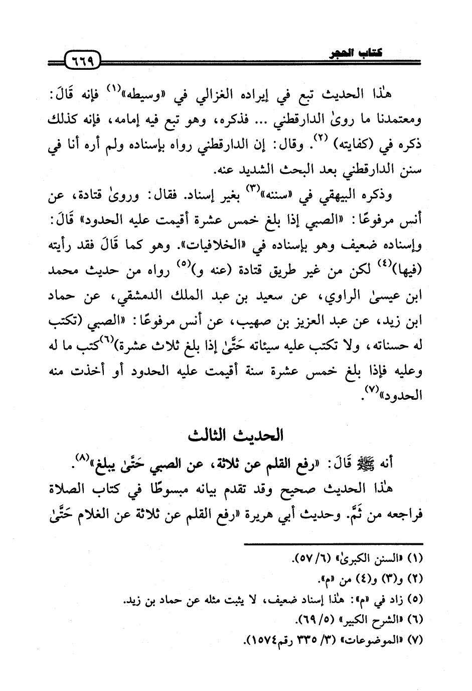 وَذكره الْبَيْهَقِيّ فِي «سنَنه» بِغَيْر إِسْنَاد. فَقَالَ: وَرَوَى قَتَادَة، عَن أنس مَرْفُوعا: «الصَّبِي إِذا بلغ خمس عشرَة أُقِيمَت عَلَيْهِ الْحُدُود» قَالَ: وَإِسْنَاده ضَعِيف وَهُوَ بِإِسْنَادِهِ فِي «الخلافيات» . وَهُوَ كَمَا قَالَ فقد رَأَيْته (فِيهَا) لَكِن من غير طَرِيق قَتَادَة (عَنهُ و) رَوَاهُ من حَدِيث مُحَمَّد بن عِيسَى الرَّاوِي، عَن سعيد بن عبد الْملك الدِّمَشْقِي، عَن حَمَّاد بن زيد، عَن عبد الْعَزِيز بن صُهَيْب، عَن أنس مَرْفُوعا: «الصَّبِي (تكْتب لَهُ حَسَنَاته، وَلَا تكْتب عَلَيْهِ سيئاته حَتَّى إِذا بلغ ثَلَاث عشرَة) كتب مَا لَهُ وَعَلِيهِ فَإِذا بلغ خمس عشرَة سنة أُقِيمَت عَلَيْهِ الْحُدُود أَو أخذت مِنْهُ الْحُدُود» .