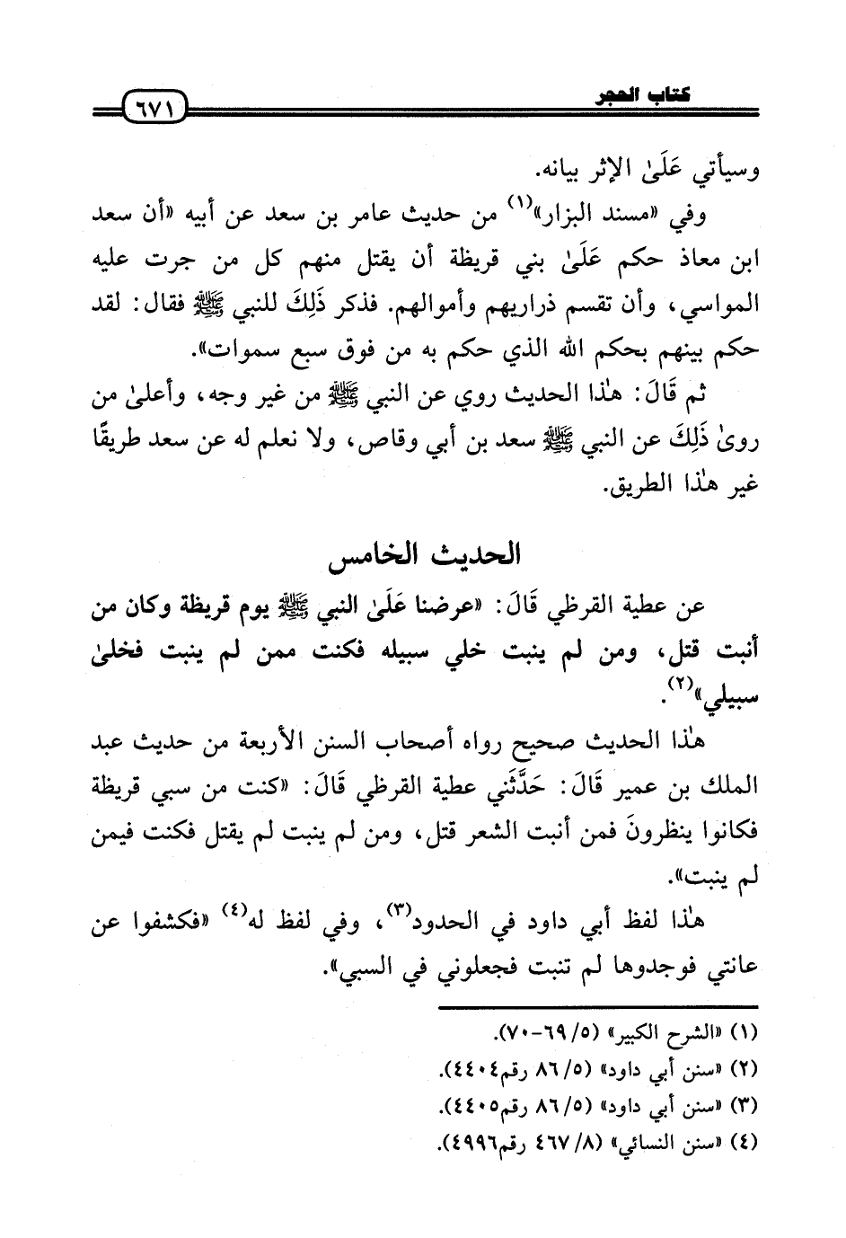 هَذَا الحَدِيث صَحِيح رَوَاهُ أَصْحَاب السّنَن الْأَرْبَعَة من حَدِيث عبد الْملك بن عُمَيْر قَالَ: حَدَّثَني عَطِيَّة الْقرظِيّ قَالَ: «كنت من سبي قُرَيْظَة فَكَانُوا ينظرونَ فَمن أنبت الشّعْر قتل، وَمن لم ينْبت لم يقتل فَكنت فِيمَن لم ينْبت» .
