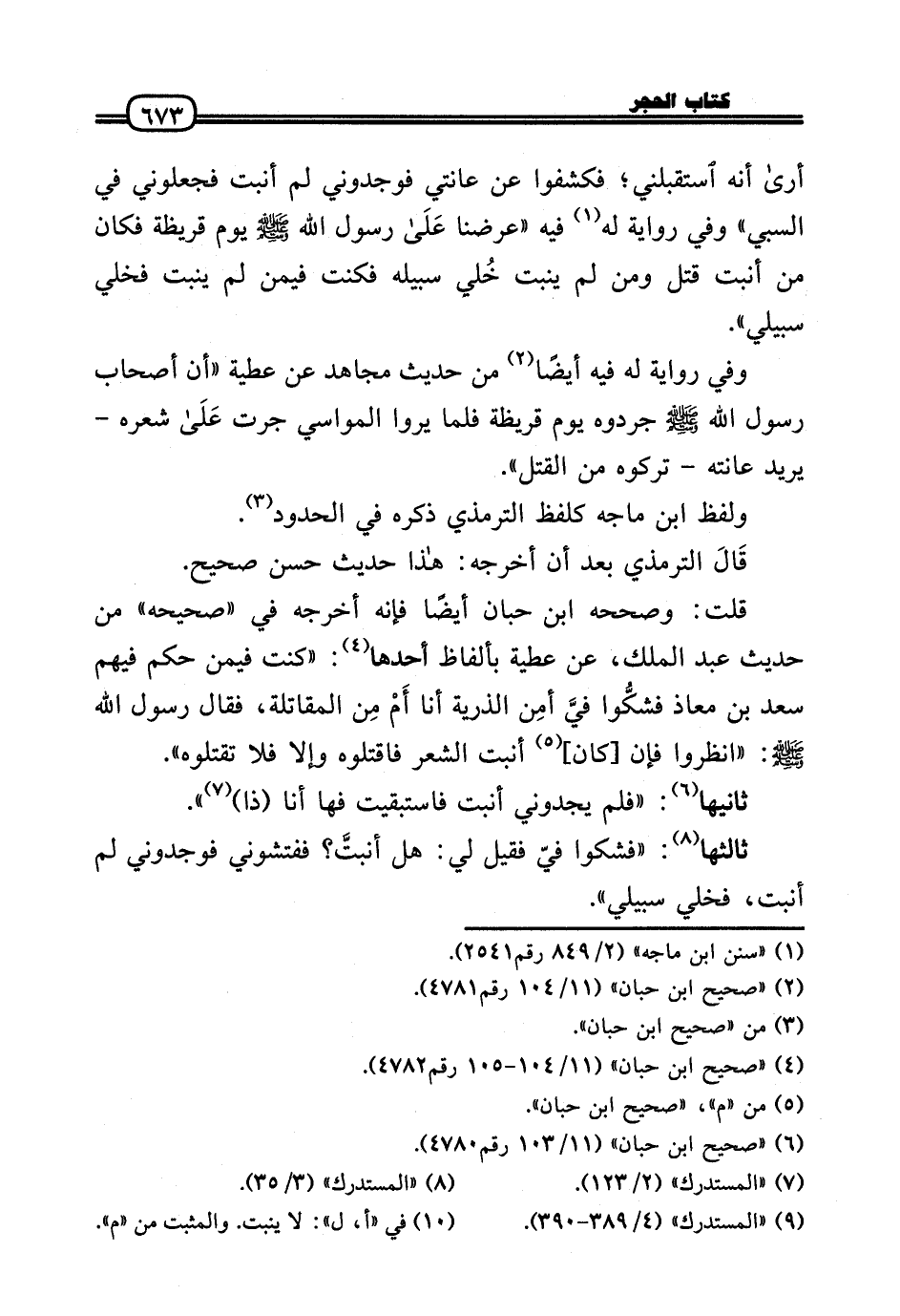 أرَى أَنه استقبلني؛ فكشفوا عَن عانتي فوجدوني لم أنبت فجعلوني فِي السَّبي» وَفِي رِوَايَة لَهُ فِيهِ «عرضنَا عَلَى رَسُول الله - صَلَّى الله عَلَيْهِ وَسلم - يَوْم قُرَيْظَة فَكَانَ من أنبت قتل وَمن لم ينْبت خُلي سَبيله فَكنت فِيمَن لم ينْبت فخلي سبيلي» .