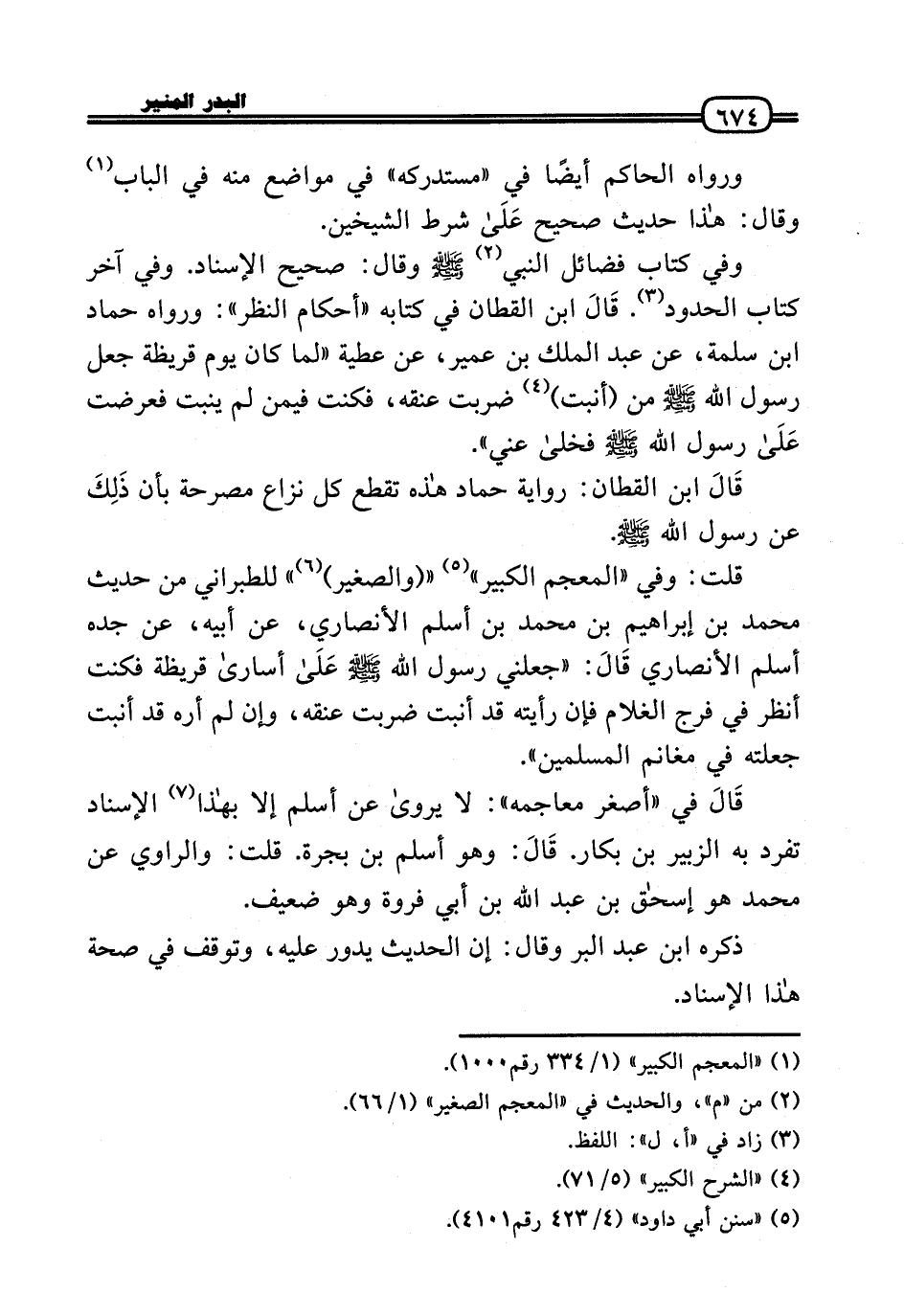وَفِي كتاب فَضَائِل النيب (وَقَالَ: صَحِيح الْإِسْنَاد. وَفِي آخر كتاب الْحُدُود. قَالَ ابْن الْقطَّان فِي كِتَابه «أَحْكَام النّظر» : وَرَوَاهُ حَمَّاد بن سَلمَة عَن عبد الْملك بن عُمَيْر عَن عَطِيَّة «لما كَانَ يَوْم قُرَيْظَة جعل رَسُول الله - صَلَّى الله عَلَيْهِ وَسلم - من (أنبت) ضربت عُنُقه، فَكنت فِيمَن لم ينْبت فعرضت عَلَى رَسُول الله - صَلَّى الله عَلَيْهِ وَسلم - فخلى عني» .