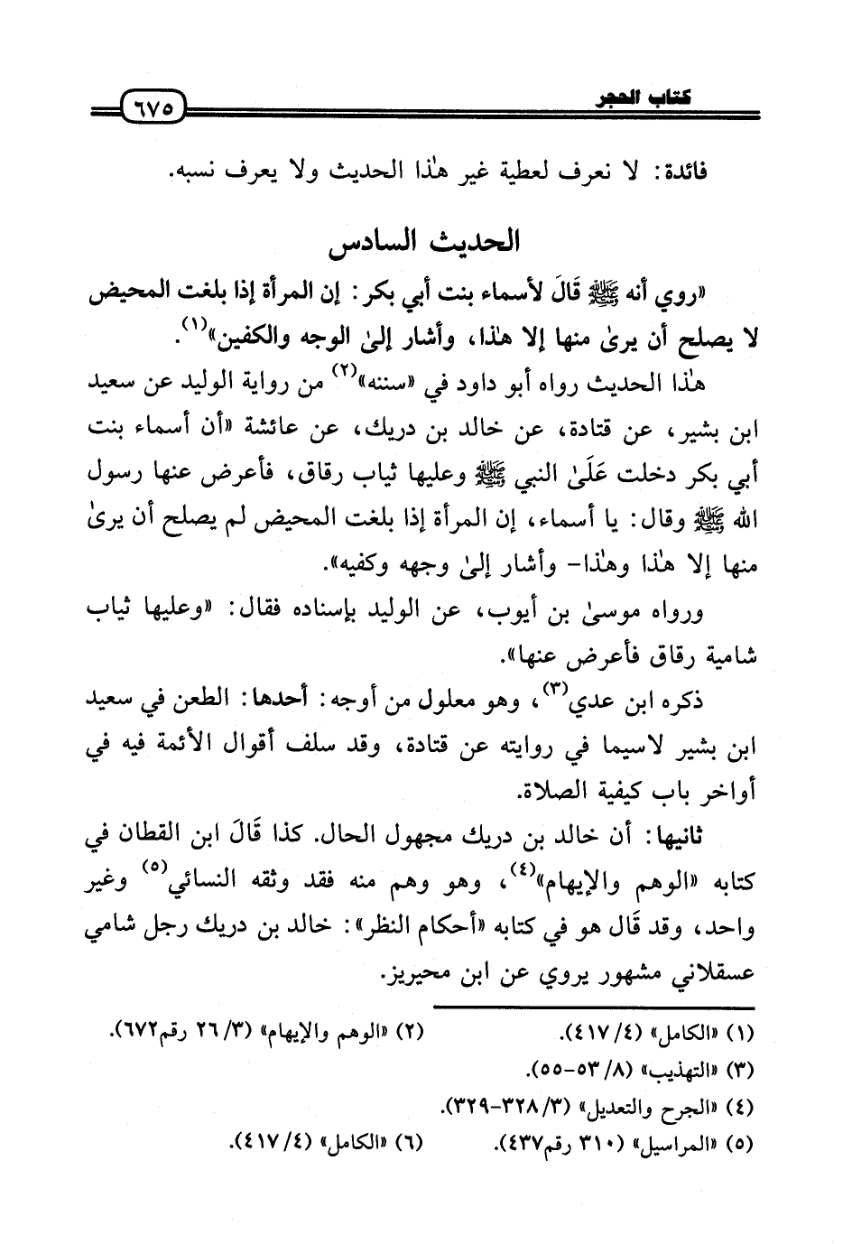 هَذَا الحَدِيث رَوَاهُ أَبُو دَاوُد فِي «سنَنه» من رِوَايَة الْوَلِيد عَن سعيد بن بشير، عَن قَتَادَة، عَن خَالِد بن دريك، عَن عَائِشَة «أَن أَسمَاء بنت أبي بكر دخلت عَلَى النَّبِي - صَلَّى الله عَلَيْهِ وَسلم - وَعَلَيْهَا ثِيَاب رقاق، فَأَعْرض عَنْهَا رَسُول الله - صَلَّى الله عَلَيْهِ وَسلم - وَقَالَ: يَا أَسمَاء، إِن الْمَرْأَة إِذا بلغت الْمَحِيض لم يصلح أَن يرَى مِنْهَا إِلَّا هَذَا وَهَذَا، وَأَشَارَ إِلَى وَجهه وكفيه» .