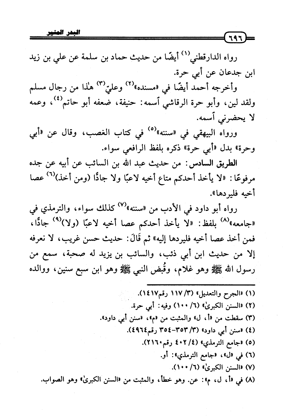رَوَاهُ أَبُو دَاوُد فِي الْأَدَب من «سنَنه» كَذَلِك سَوَاء، وَالتِّرْمِذِيّ فِي «جَامعه» بِلَفْظ: «لَا يَأْخُذ أحدكُم عَصا أَخِيه لاعبًا (وَلَا) جادًّا، فَمن أَخذ عَصا أَخِيه فليردها إِلَيْهِ» ثمَّ قَالَ: حَدِيث حسن غَرِيب، لَا نعرفه إِلَّا من حَدِيث ابْن أبي ذِئْب، والسائب بن يزِيد لَهُ صُحْبَة، سمع من رَسُول الله - صَلَّى الله عَلَيْهِ وَسلم - وَهُوَ غُلَام، وقُبض النَّبِي - صَلَّى الله عَلَيْهِ وَسلم - وَهُوَ ابْن سبع سِنِين، ووالده