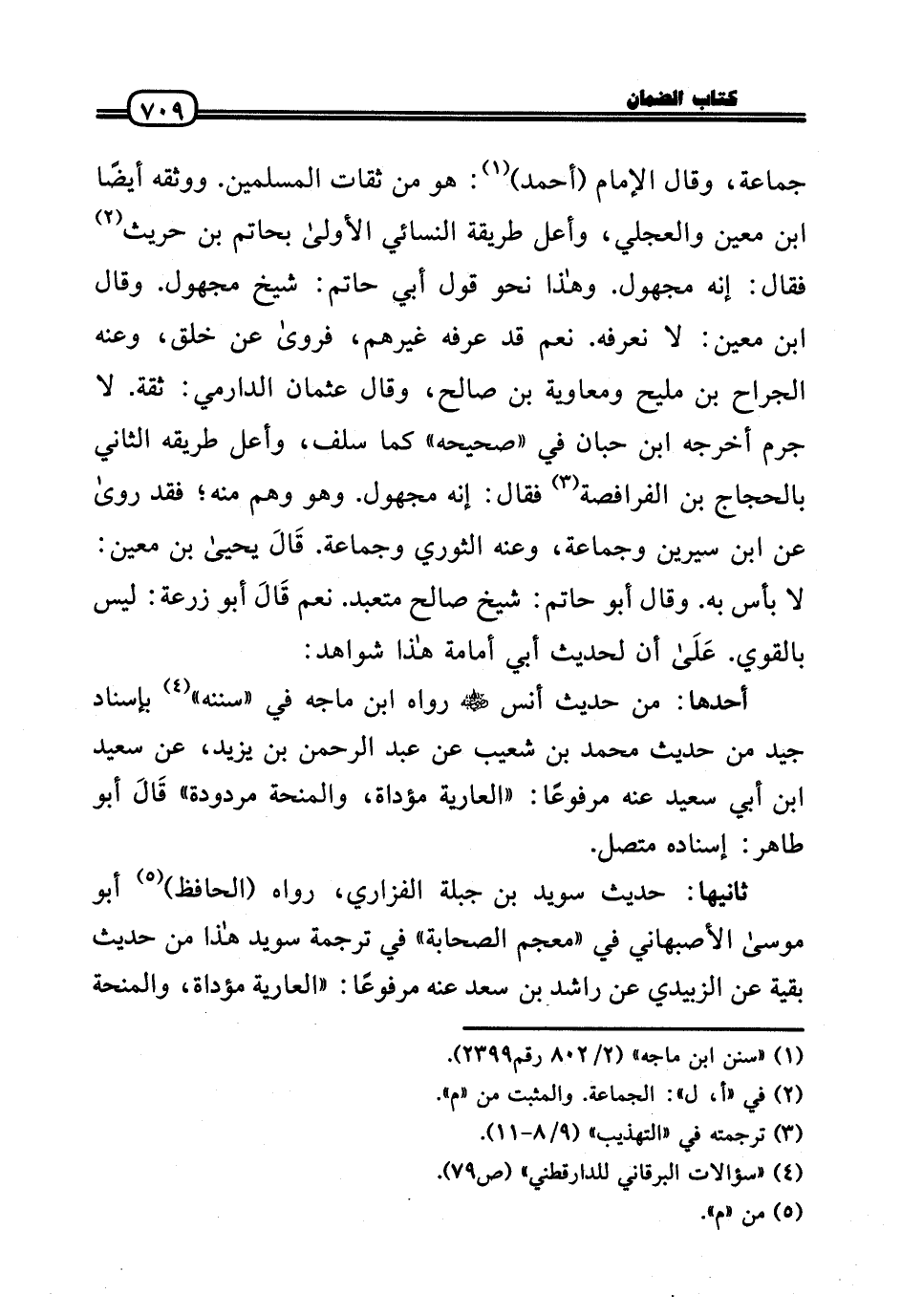 جمَاعَة، وَقَالَ الإِمَام (أَحْمد) : هُوَ من ثِقَات الْمُسلمين. وَوَثَّقَهُ أَيْضا ابْن معِين وَالْعجلِي، وأعل طَريقَة النَّسَائِيّ الأولَى بحاتم بن حُرَيْث فَقَالَ: إِنَّه مَجْهُول. وَهَذَا نَحْو قَول أبي حَاتِم: شيخ مَجْهُول. وَقَالَ ابْن معِين: لَا نعرفه. نعم قد عرفه غَيرهم، فروَى عَن خلق، وَعنهُ الْجراح بن مليح وَمُعَاوِيَة بن صَالح، وَقَالَ عُثْمَان الدَّارمِيّ: ثِقَة. لَا جرم أخرجه ابْن حبَان فِي «صَحِيحه» كَمَا سلف، وأعل طَرِيقه الثَّانِي بالحجاج بن الفرافصة فَقَالَ: إِنَّه مَجْهُول. وَهُوَ وهم مِنْهُ؛ فقد رَوَى عَن ابْن سِيرِين وَجَمَاعَة، وَعنهُ الثَّوْريّ وَجَمَاعَة. قَالَ يَحْيَى بن معِين: لَا بَأْس بِهِ. وَقَالَ أَبُو حَاتِم: شيخ صَالح متعبد. نعم قَالَ أَبُو زرْعَة: لَيْسَ بِالْقَوِيّ. عَلَى أَن لحَدِيث أبي أُمَامَة هَذَا شَوَاهِد: