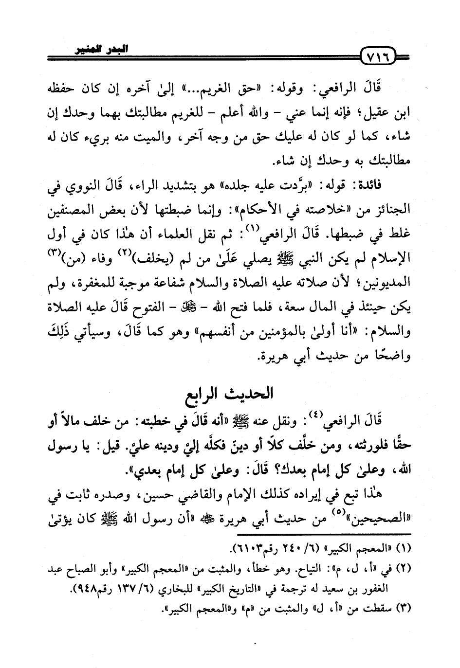 قَالَ الرَّافِعِيّ: وَنقل عَنهُ « (أَنه قَالَ فِي خطبَته: من خلف مَالا أَو حقًّا فلورثته، وَمن خلَّف كلا أَو دين فكلَّه إليَّ وَدينه عليَّ. قيل: يَا رَسُول الله، وَعَلَى كل إِمَام بعْدك؟ قَالَ: وَعَلَى كل إِمَام بعدِي» .