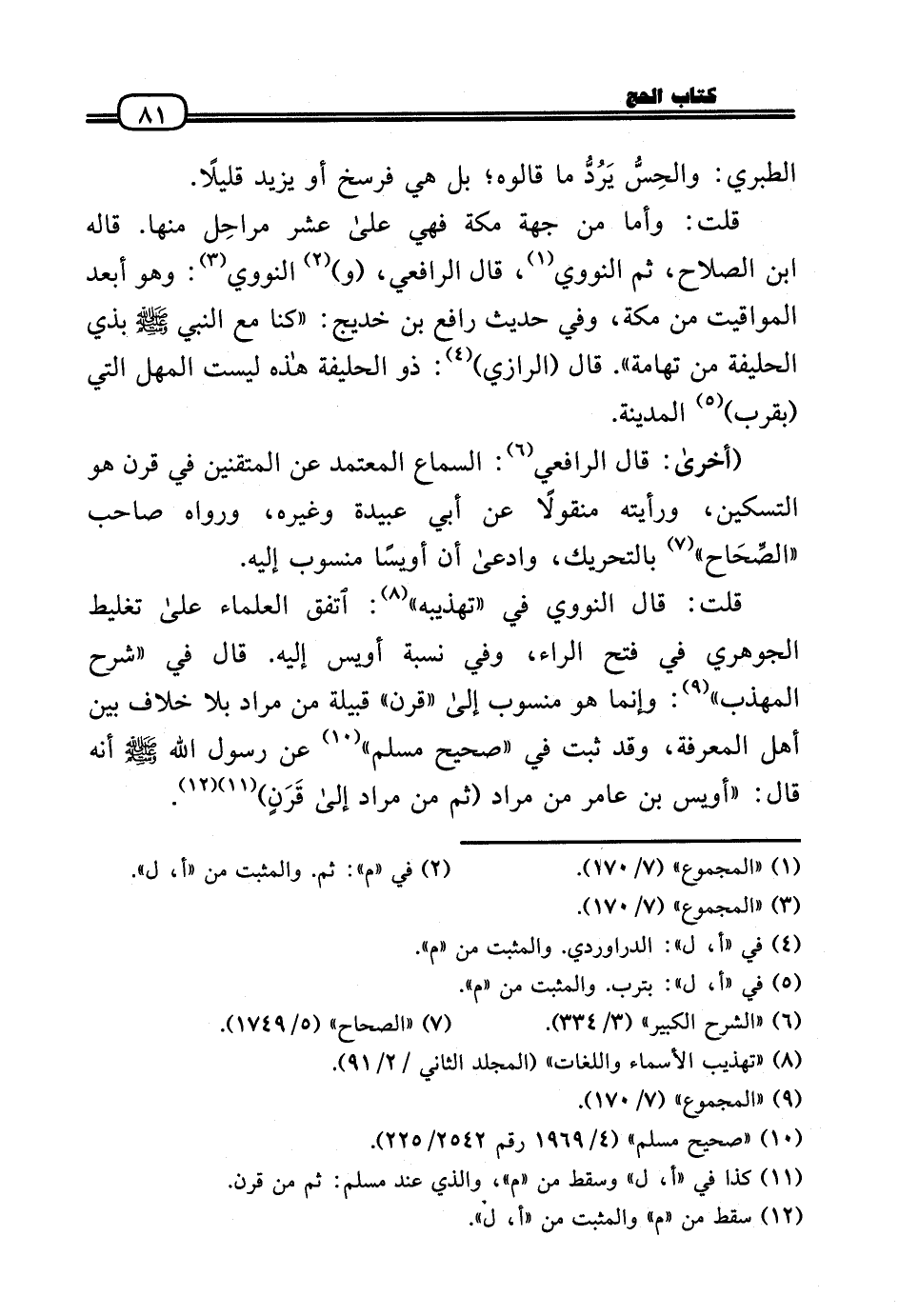قلت: قَالَ النَّوَوِيّ فِي «تهذيبه» : اتّفق الْعلمَاء عَلَى تغليط الْجَوْهَرِي فِي فتح الرَّاء، وَفِي نِسْبَة أويس إِلَيْهِ. قَالَ فِي «شرح الْمُهَذّب» : وَإِنَّمَا هُوَ مَنْسُوب إِلَى «قرن» قَبيلَة من مُرَاد بِلَا خلاف بَين أهل الْمعرفَة، وَقد ثَبت فِي «صَحِيح مُسلم» عَن رَسُول الله - صَلَّى الله عَلَيْهِ وَسلم - أَنه قَالَ: «أويس بن عَامر من مُرَاد (ثمَّ من مُرَاد إِلَى قَرَنٍ)) .