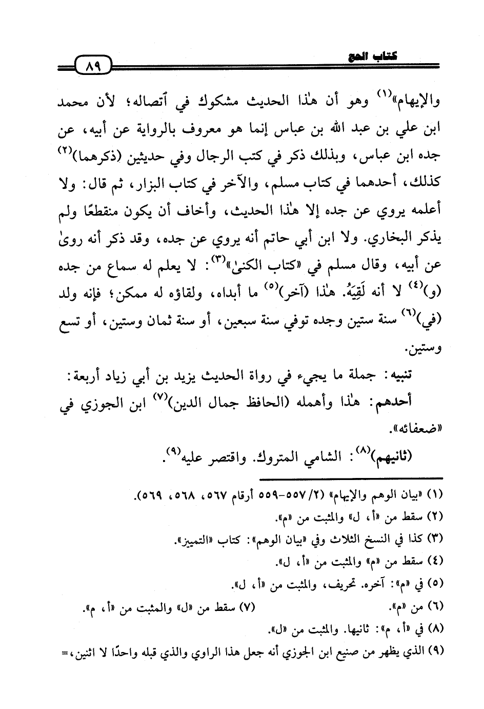 وَالْإِيهَام» وَهُوَ أَن هَذَا الحَدِيث مَشْكُوك فِي اتِّصَاله؛ لِأَن مُحَمَّد بن عَلّي بن عبد الله بن عَبَّاس إِنَّمَا هُوَ مَعْرُوف بالرواية عَن أَبِيه، عَن جده ابْن عَبَّاس، وَبِذَلِك ذكر فِي كتب الرِّجَال وَفِي حديثين (ذكرهمَا) كَذَلِك، أَحدهمَا فِي كتاب مُسلم، وَالْآخر فِي كتاب الْبَزَّار، ثمَّ قَالَ: وَلَا أعلمهُ يروي عَن جده إِلَّا هَذَا الحَدِيث، وأخاف أَن يكون مُنْقَطِعًا وَلم يذكر البُخَارِيّ. وَلَا ابْن أبي حَاتِم أَنه يروي عَن جده، وَقد ذكر أَنه رَوَى عَن أَبِيه، وَقَالَ مُسلم فِي «كتاب الكنى» : لَا يعلم لَهُ سَماع من جده (و) لَا أَنه لَقِيَهُ. هَذَا (آخر) مَا أبداه، ولقاؤه لَهُ مُمكن؛ فَإِنَّهُ ولد (فِي) سنة سِتِّينَ وجده توفّي سنة سبعين، أَو سنة ثَمَان وَسِتِّينَ، أَو تسع وَسِتِّينَ.