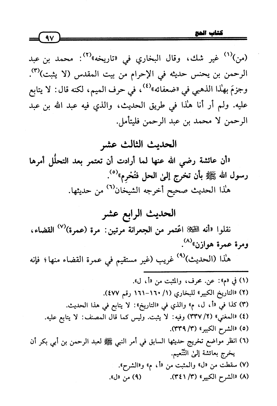 (من) غير شكّ، وَقَالَ البُخَارِيّ فِي «تَارِيخه» : مُحَمَّد بن عبد الرَّحْمَن بن يحنس حَدِيثه فِي الْإِحْرَام من بَيت الْمُقَدّس (لَا يثبت) . وجزمَ بِهَذَا الذَّهَبِيّ فِي «ضُعَفَائِهِ» ، فِي حرف الْمِيم، لكنه قَالَ: لَا يُتَابع عَلَيْهِ. وَلم أر أَنا هَذَا فِي طَرِيق الحَدِيث، وَالَّذِي فِيهِ عبد الله بن عبد الرَّحْمَن لَا مُحَمَّد بن عبد الرَّحْمَن فَلْيتَأَمَّل.