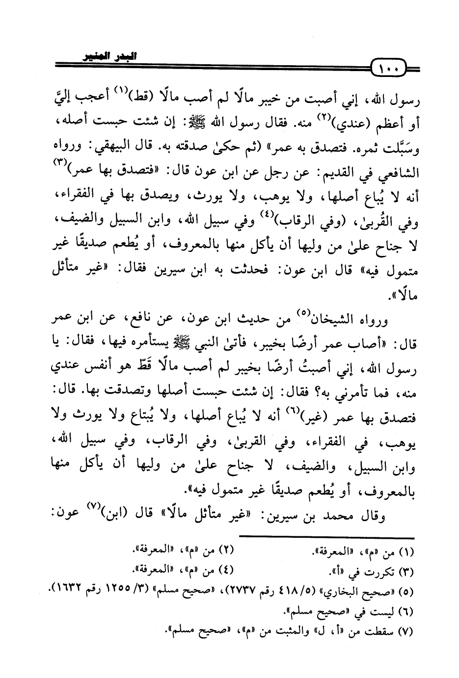 وَرَوَاهُ الشَّيْخَانِ من حَدِيث ابْن عون، عَن نَافِع، عَن ابْن عمر قَالَ: «أصَاب عمر أَرضًا بِخَيْبَر، فَأَتَى النَّبِي - صَلَّى الله عَلَيْهِ وَسلم - يستأمره فِيهَا، فَقَالَ: يَا رَسُول الله، إِنِّي أصبتُ أَرضًا بِخَيْبَر لم أصب مَالا قَطّ هُوَ أنفس عِنْدِي مِنْهُ، فَمَا تَأْمُرنِي بِهِ؟ فَقَالَ: إِن شِئْت حبست أَصْلهَا وتصدقت بهَا. قَالَ: فَتصدق بهَا عمر (غير) أَنه لَا يُباع أَصْلهَا، وَلَا يُبتاع وَلَا يُورث وَلَا يُوهب، فِي الْفُقَرَاء، وَفِي الْقُرْبَى، وَفِي الرّقاب، وَفِي سَبِيل الله، وَابْن السَّبِيل، والضيف، لَا جنَاح عَلَى من وَليهَا أَن يَأْكُل مِنْهَا بِالْمَعْرُوفِ، أَو يُطعم صديقا غير مُتَمَوّل فِيهِ» .