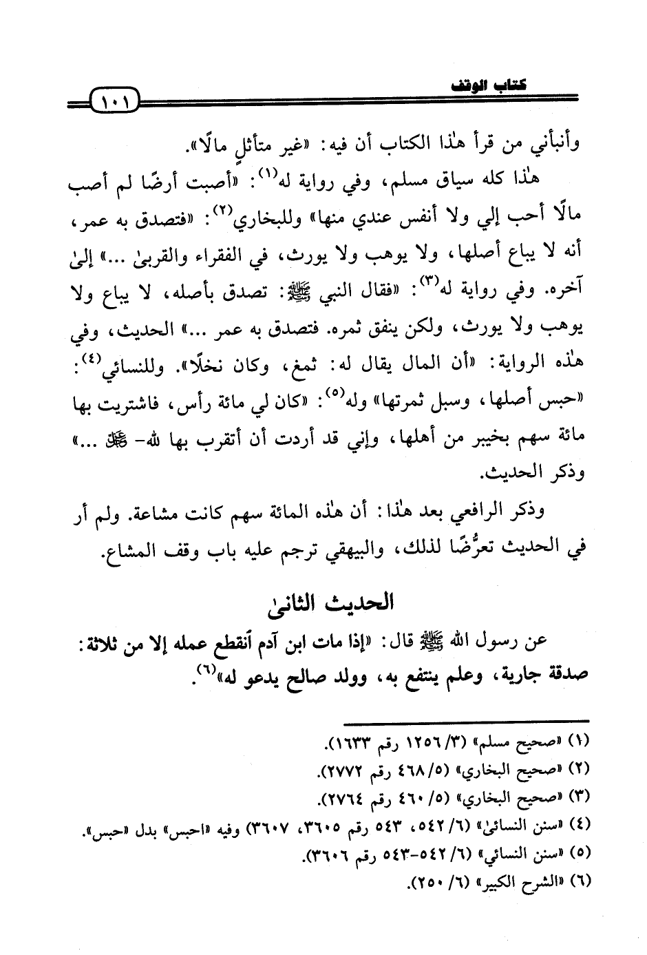هَذَا كُله سِيَاق مُسلم، وَفِي رِوَايَة لَهُ: «أصبت أَرضًا لم أصب مَالا أحب إِلَيّ وَلَا أنفس عِنْدِي مِنْهَا» وللبخاري: «فَتصدق بِهِ عمر، أَنه لَا يُبَاع أَصْلهَا، وَلَا يُوهب وَلَا يُورث، فِي الْفُقَرَاء والقربى ... » إِلَى آخِره. وَفِي رِوَايَة لَهُ: «فَقَالَ النَّبِي - صَلَّى الله عَلَيْهِ وَسلم -: تصدق بِأَصْلِهِ، لَا يُبَاع وَلَا يُوهب وَلَا يُورث، وَلَكِن ينْفق ثمره. فَتصدق بِهِ عمر ... » الحَدِيث، وَفِي هَذِه الرِّوَايَة: «أَن المَال يُقَال لَهُ: ثمغ، وَكَانَ نخلا» . وللنسائي: «حبس أَصْلهَا، وسبل ثَمَرَتهَا» وَله: «كَانَ لي مائَة رَأس، فاشتريت بهَا مائَة سهم بِخَيْبَر من أَهلهَا، وَإِنِّي قد أردْت أَن أَتَقَرَّب بهَا لله - عَزَّ وَجَلَّ ... » وَذكر الحَدِيث.