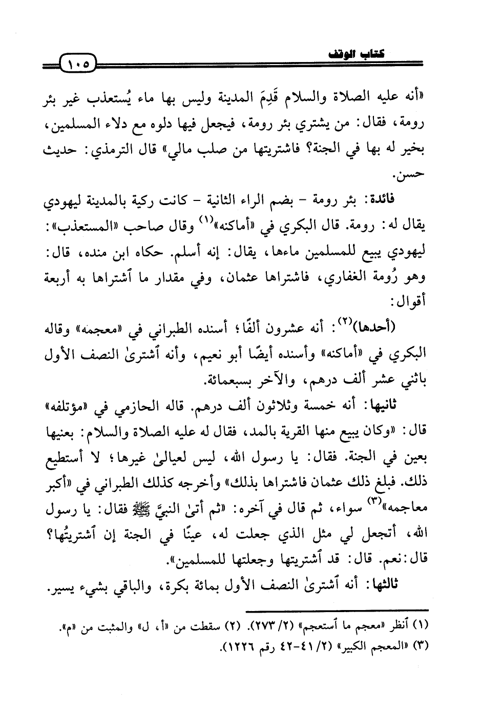 «أَنه عَلَيْهِ الصَّلَاة وَالسَّلَامُ قَدِمَ الْمَدِينَة وَلَيْسَ بهَا مَاء يُستعذب غير بِئْر رومة، فَقَالَ: من يَشْتَرِي بِئْر رومة، فَيجْعَل فِيهَا دلوه مَعَ دلاء الْمُسلمين، بِخَير لَهُ بهَا فِي الْجنَّة؟ فاشتريتها من صلب مَالِي» قَالَ التِّرْمِذِيّ: حَدِيث حسن.