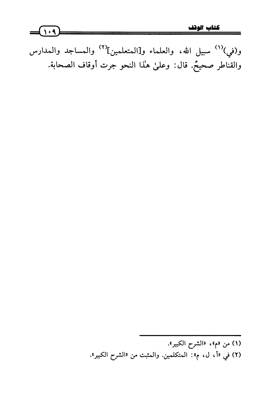 و (فِي) سَبِيل الله، وَالْعُلَمَاء و [المتعلمين] والمساجد والمدارس والقناطر صحيحٌ. قَالَ: وَعَلَى هَذَا النَّحْو جرت أوقاف الصَّحَابَة.