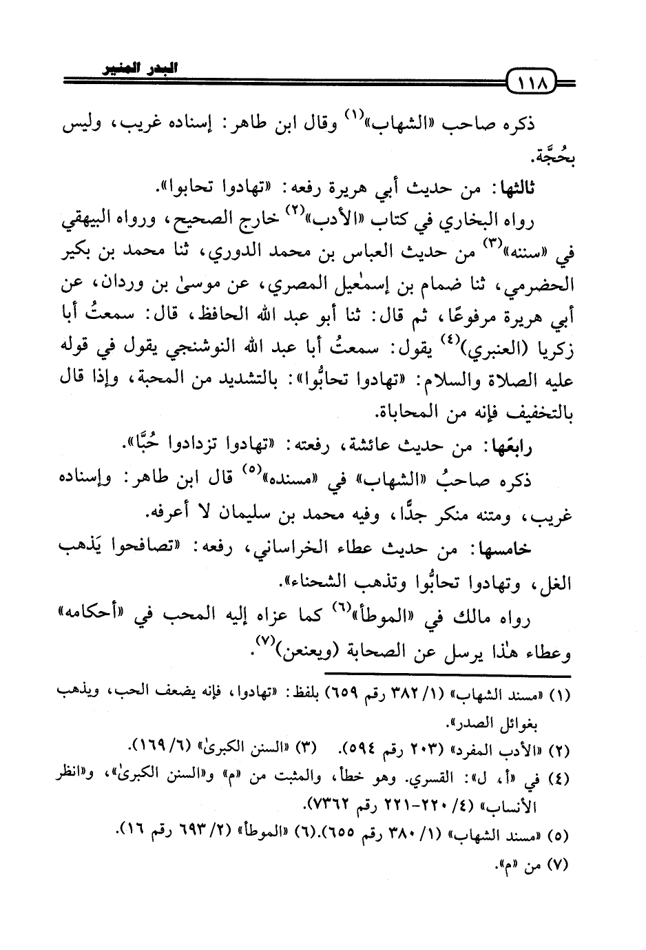 رَوَاهُ البُخَارِيّ فِي كتاب «الْأَدَب» خَارج الصَّحِيح، وَرَوَاهُ الْبَيْهَقِيّ فِي «سنَنه» من حَدِيث الْعَبَّاس بن مُحَمَّد الدوري، ثَنَا مُحَمَّد بن بكير الْحَضْرَمِيّ، ثَنَا ضمام بن إِسْمَاعِيل الْمصْرِيّ، عَن مُوسَى بن وردان، عَن أبي هُرَيْرَة مَرْفُوعا، ثمَّ قَالَ: ثَنَا أَبُو عبد الله الْحَافِظ، قَالَ: سمعتُ أَبَا زَكَرِيَّا (الْعَنْبَري) يَقُول: سمعتُ أَبَا عبد الله النوشنجي يَقُول فِي قَوْله عَلَيْهِ الصَّلَاة وَالسَّلَامُ: «تهادوا تحابُّوا» : بِالتَّشْدِيدِ من الْمحبَّة، وَإِذا قَالَ بِالتَّخْفِيفِ فَإِنَّهُ من الْمُحَابَاة.