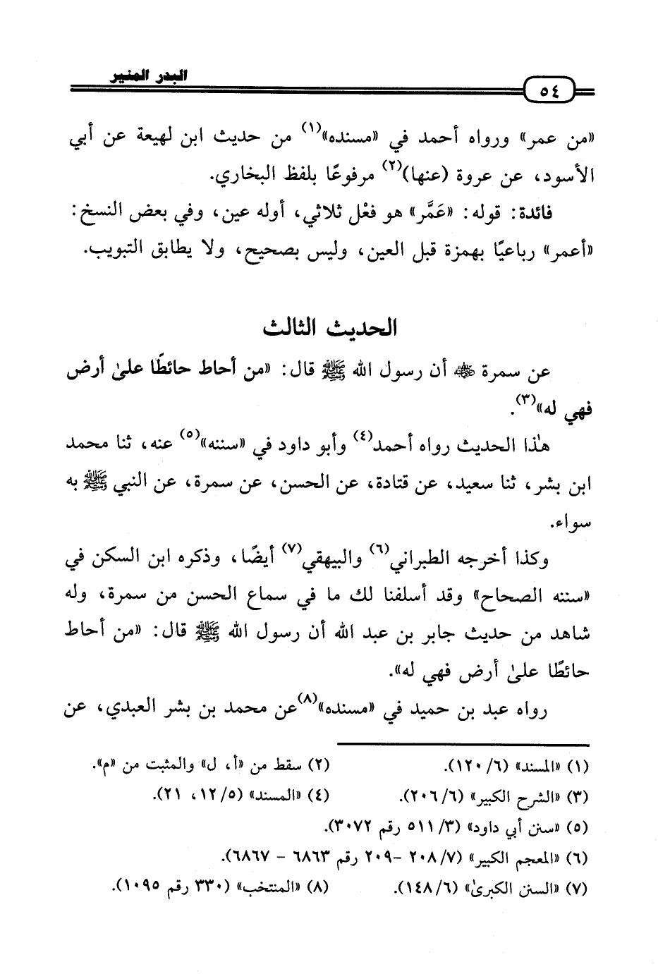 وَكَذَا أخرجه الطَّبَرَانِيّ وَالْبَيْهَقِيّ أَيْضا، وَذكره ابْن السكن فى «سنَنه الصِّحَاح» وَقد أسلفنا لَك مَا فِي سَماع الْحسن من سَمُرَة، وَله شَاهد من حَدِيث جَابر بن عبد الله أَن رَسُول الله - صَلَّى الله عَلَيْهِ وَسلم - قَالَ: «من أحَاط حَائِطا عَلَى أَرض فَهِيَ لَهُ» .