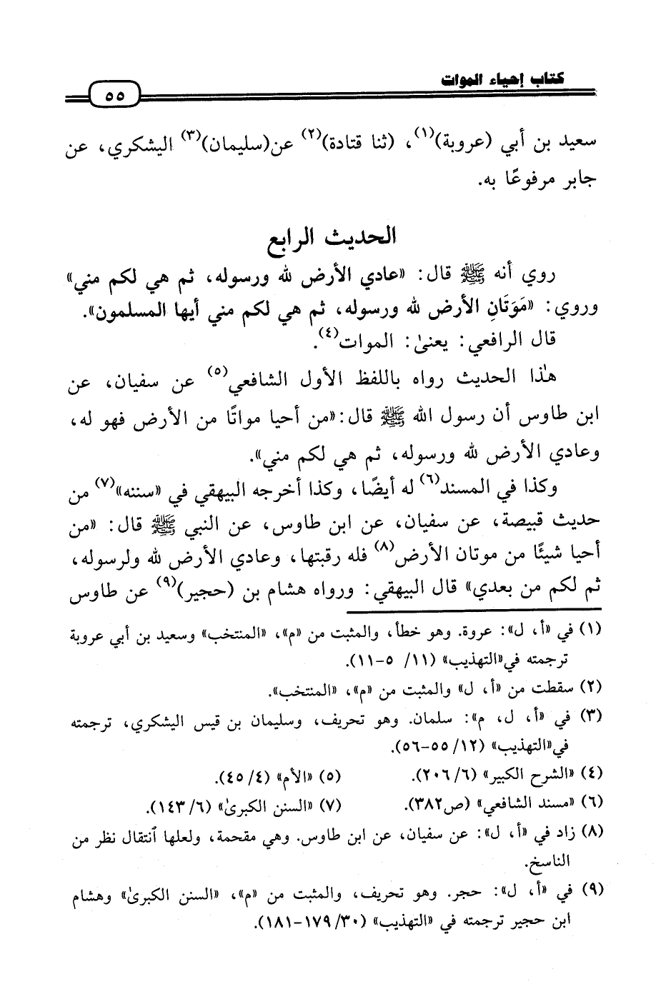 هَذَا الحَدِيث رَوَاهُ بِاللَّفْظِ الأول الشَّافِعِي عَن سُفْيَان، عَن ابْن طَاوس أَن رَسُول الله - صَلَّى الله عَلَيْهِ وَسلم - قَالَ: «من أَحْيَا مواتًا من الأَرْض فَهُوَ لَهُ، وعادىِ الأَرْض لله وَرَسُوله، ثمَّ هِيَ لكم مني» .