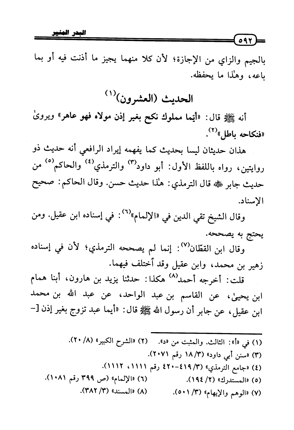 قلت: أخرجه أَحْمد هَكَذَا: حَدثنَا يزِيد بن هَارُون، أبنا همام بن يَحْيَى، عَن الْقَاسِم بن عبد الْوَاحِد، عَن عبد الله بن مُحَمَّد بن عقيل، عَن جَابر أَن رَسُول الله - صَلَّى الله عَلَيْهِ وَسلم - قَالَ: «أَيّمَا عبد تزوج بِغَيْر إِذن [-