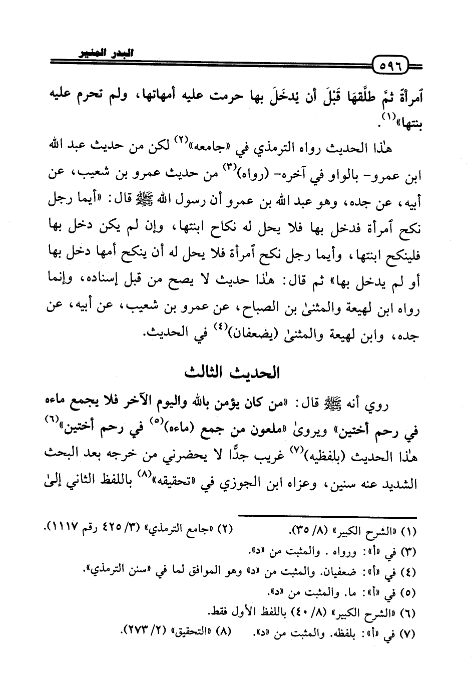 هَذَا الحَدِيث رَوَاهُ التِّرْمِذِيّ فِي «جَامعه» لَكِن من حَدِيث عبد الله بن عَمْرو - بِالْوَاو فِي آخِره - (رَوَاهُ) من حَدِيث عَمْرو بن شُعَيْب، عَن أَبِيه، عَن جده، وَهُوَ عبد الله بن عَمْرو أَن رَسُول الله - صَلَّى الله عَلَيْهِ وَسلم - قَالَ: «أَيّمَا رجل نكح امْرَأَة فَدخل بهَا فَلَا يحل لَهُ نِكَاح ابْنَتهَا، وَإِن لم يكن دخل بهَا فَلْيَنْكِح ابْنَتهَا، وَأَيّمَا رجل نكح امْرَأَة فَلَا يحل لَهُ أَن ينْكح أمهَا دخل بهَا أَو لم يدْخل بهَا» ثمَّ قَالَ: هَذَا حَدِيث لَا يَصح من قبل إِسْنَاده، وَإِنَّمَا رَوَاهُ ابْن لَهِيعَة والمثنى بن الصَّباح، عَن عَمْرو بن شُعَيْب، عَن أَبِيه، عَن جده، وَابْن لَهِيعَة والمثنى (يُضعفَانِ) فِي الحَدِيث.