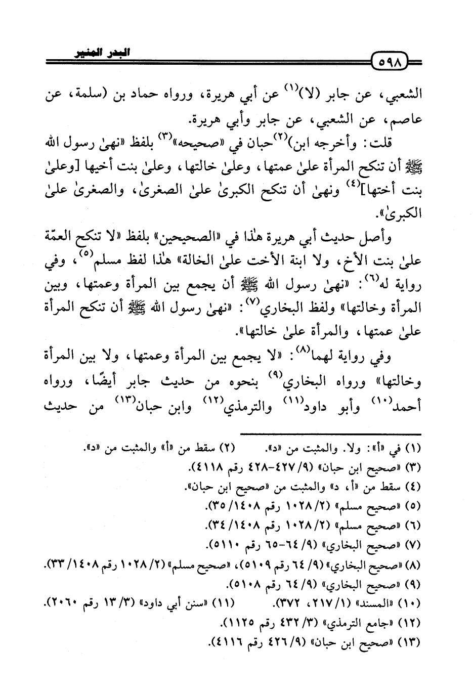قلت: وَأخرجه ابْن) حبَان فِي «صَحِيحه» بِلَفْظ «نهَى رَسُول الله - صَلَّى الله عَلَيْهِ وَسلم - أَن تنْكح الْمَرْأَة عَلَى عَمَّتهَا، وَعَلَى خَالَتهَا، وَعَلَى بنت أَخِيهَا [وَعَلَى بنت أُخْتهَا] وَنَهَى أَن تنْكح الْكُبْرَى عَلَى الصُّغْرَى، وَالصُّغْرَى عَلَى الْكُبْرَى» .
