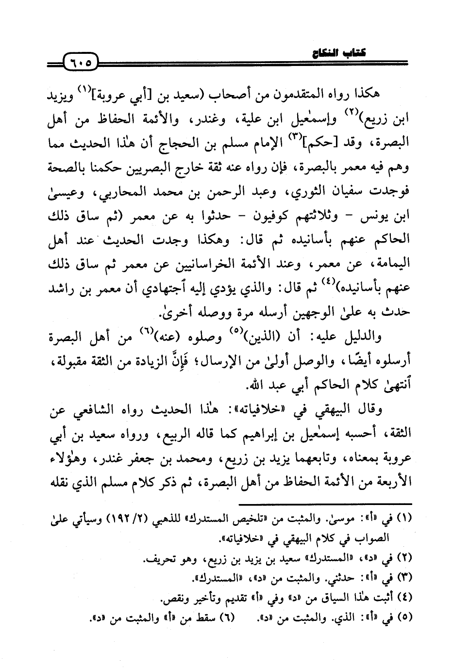 هَكَذَا رَوَاهُ المتقدمون من أَصْحَاب (سعيد بن [أبي عرُوبَة] وَيزِيد بن زُرَيْع) وَإِسْمَاعِيل ابْن علية، وغندر، وَالْأَئِمَّة الْحفاظ من أهل الْبَصْرَة، وَقد [حكم] الإِمَام مُسلم بن الْحجَّاج أَن هَذَا الحَدِيث مِمَّا وهم فِيهِ معمر بِالْبَصْرَةِ، فَإِن رَوَاهُ عَنهُ ثِقَة خَارج الْبَصرِيين حكمنَا بِالصِّحَّةِ فَوجدت سُفْيَان الثَّوْريّ، وَعبد الرَّحْمَن بن مُحَمَّد الْمحَاربي، وَعِيسَى بن يُونُس - وثلاثتهم كوفيون - حدثوا بِهِ عَن معمر (ثمَّ سَاق ذَلِك الْحَاكِم عَنْهُم بأسانيده ثمَّ قَالَ: وَهَكَذَا وجدت الحَدِيث عِنْد أهل الْيَمَامَة، عَن معمر، وَعند الْأَئِمَّة الخراسانيين عَن معمر ثمَّ سَاق ذَلِك عَنْهُم بأسانيده) ثمَّ قَالَ: وَالَّذِي يُؤَدِّي إِلَيْهِ اجتهادي أَن معمر بن رَاشد حدث بِهِ عَلَى الْوَجْهَيْنِ أرْسلهُ مرّة وَوَصله أُخْرَى.