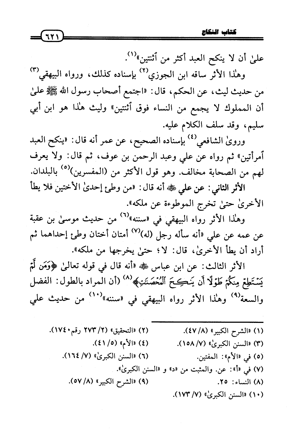 وَرَوَى الشَّافِعِي بِإِسْنَادِهِ الصَّحِيح، عَن عمر أَنه قَالَ: «ينْكح العَبْد امْرَأتَيْنِ» ثمَّ رَوَاهُ عَن عَلّي وَعبد الرَّحْمَن بن عَوْف، ثمَّ قَالَ: وَلَا يعرف لَهُم من الصَّحَابَة مُخَالف. وَهُوَ قَول الْأَكْثَر من (الْمُفَسّرين) بالبلدان.