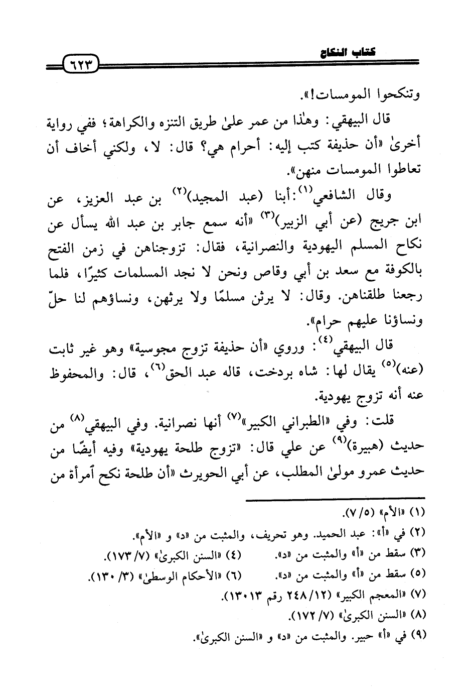 وَقَالَ الشَّافِعِي: أبنا (عبد الْمجِيد) بن عبد الْعَزِيز، عَن ابْن جريج (عَن أبي الزبير) «أَنه سمع جَابر بن عبد الله يسْأَل عَن نِكَاح الْمُسلم الْيَهُودِيَّة والنصرانية، فَقَالَ: تزوجناهن فِي زمن الْفَتْح بِالْكُوفَةِ مَعَ سعد بن أبي وَقاص وَنحن لَا نجد المسلمات كثيرا، فَلَمَّا رَجعْنَا طلقناهن. وَقَالَ: لَا يرثن مُسلما وَلَا يرثهن، وَنِسَاؤُهُمْ لنا حلّ وَنِسَاؤُنَا عَلَيْهِم حرَام» .