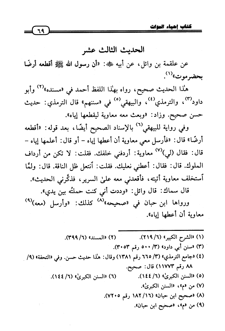 عَن عَلْقَمَة بن وَائِل، عَن أَبِيه رَضِيَ اللَّهُ عَنْه: «أَن رَسُول الله - صَلَّى الله عَلَيْهِ وَسلم - أقطعه أَرضًا بحضرموت» .